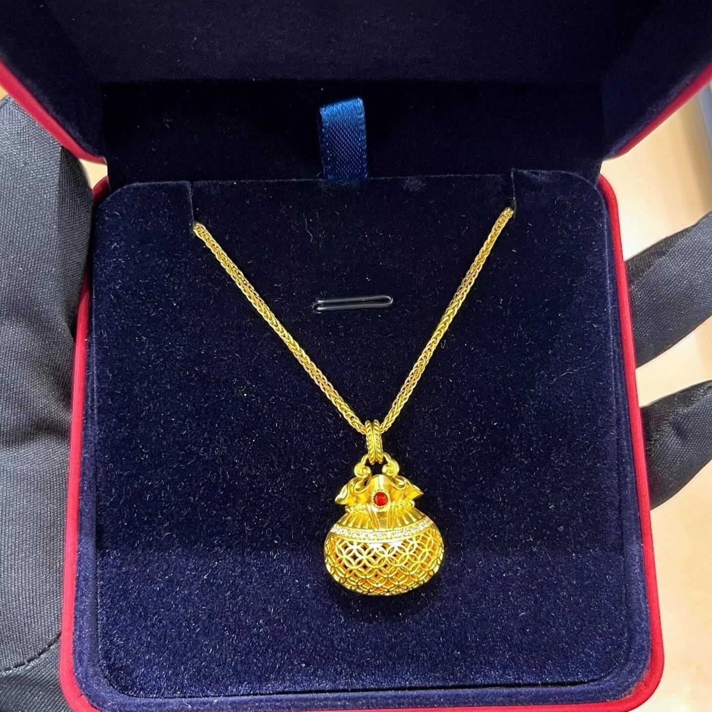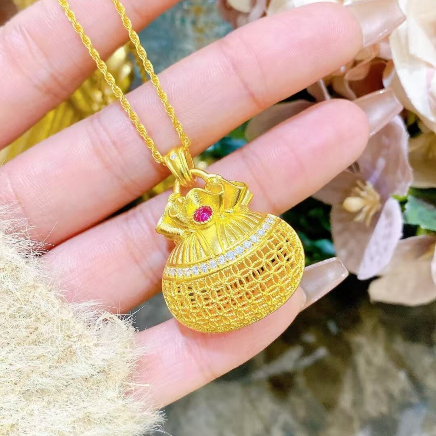 沙金镶钻福袋吊坠项链女仿真黄金镂空编织花丝福袋锁骨链久不掉色