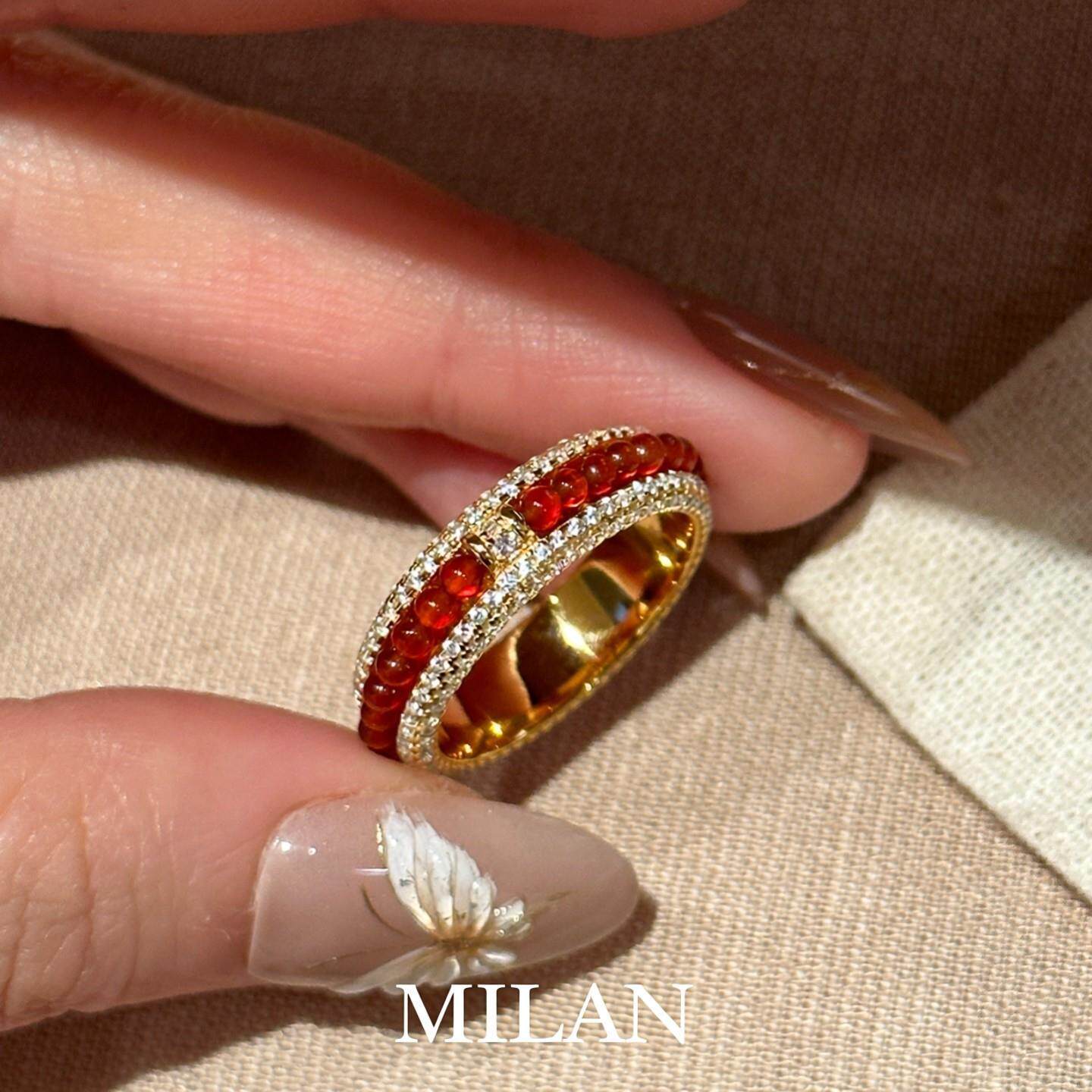 S925纯银编织红色玛瑙串珠戒指女小众设计复古时尚气质新年食指戒