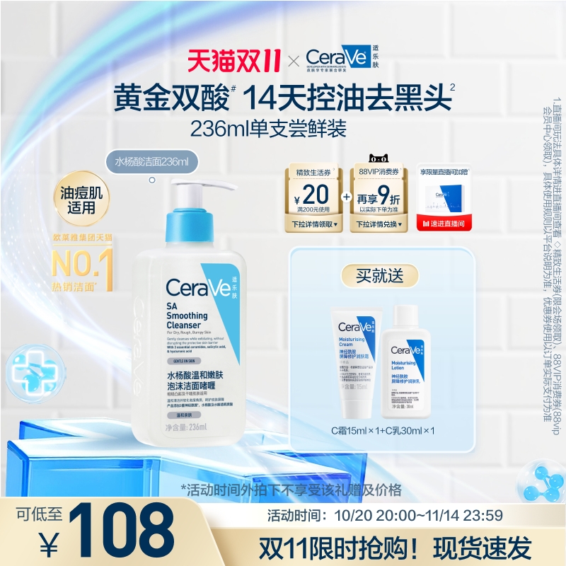 【双11疯抢】CeraVe适乐肤水杨酸氨基酸洗面奶去黑头控油男女士