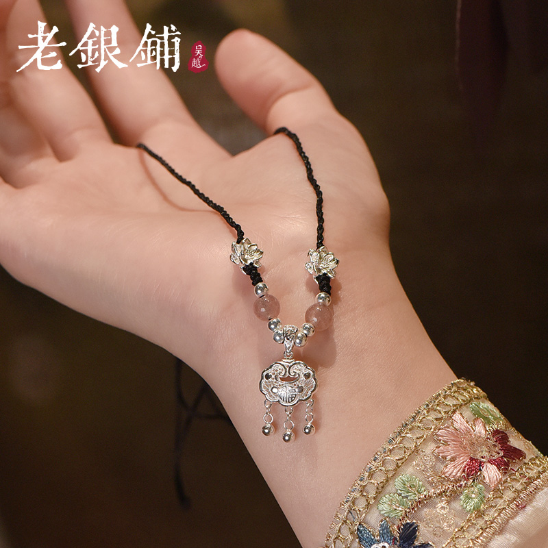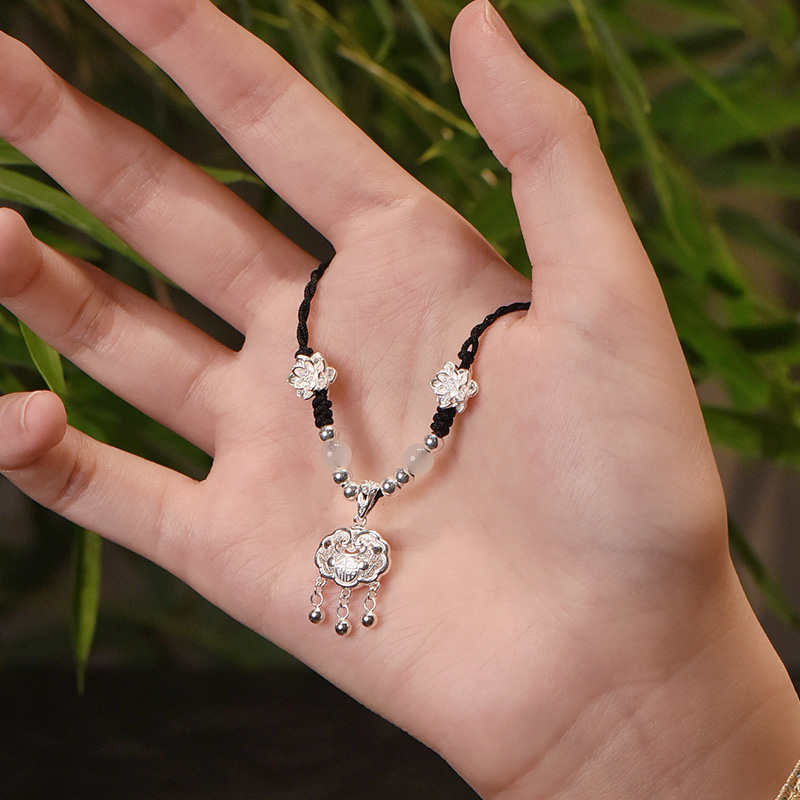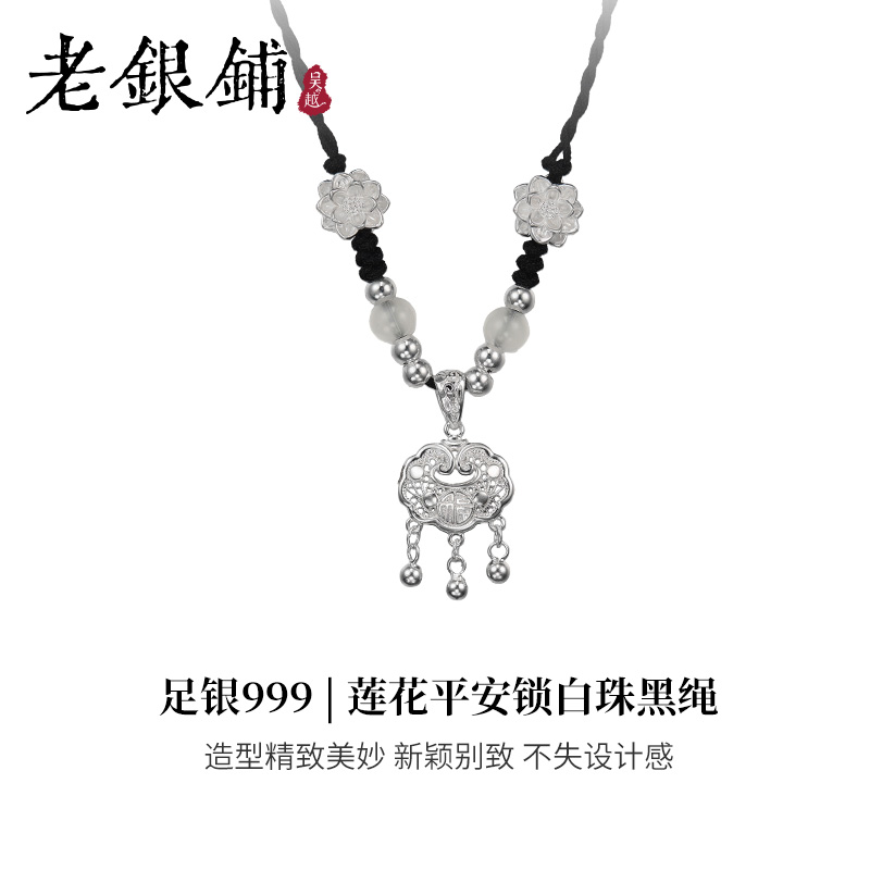 吴越老银铺足银999莲花平安锁复古中式镂空长命锁吊坠项链礼物