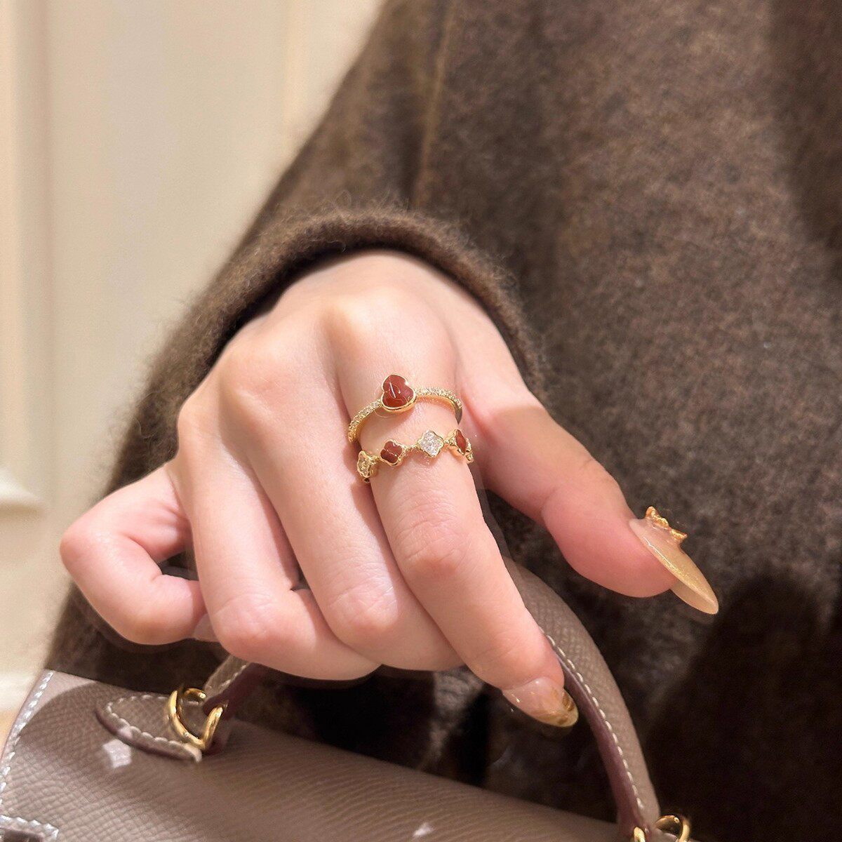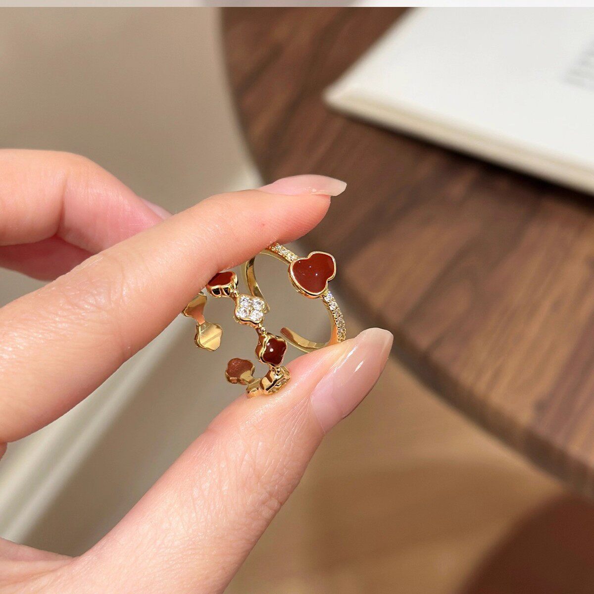 铜合金锆石戒指 红色滴油葫芦四叶花戒指开口轻奢高级感叠戴百搭