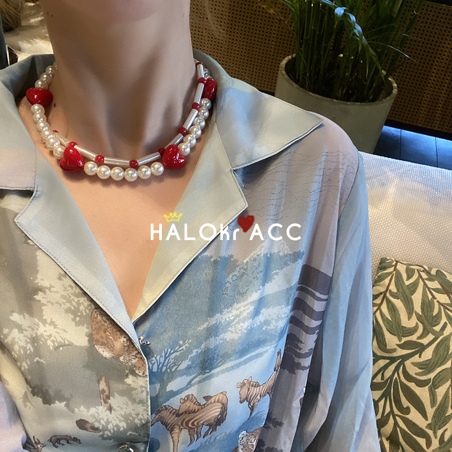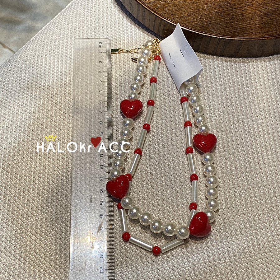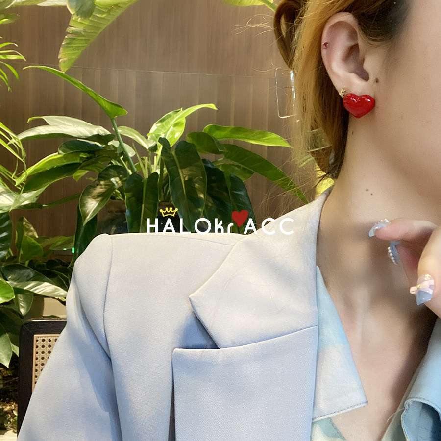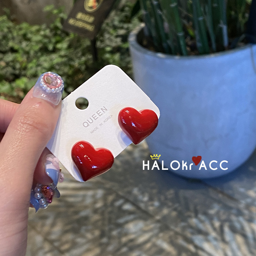 HALOkrACC韩国进口queen奶油纯红色桃心爱心耳钉间隔项链