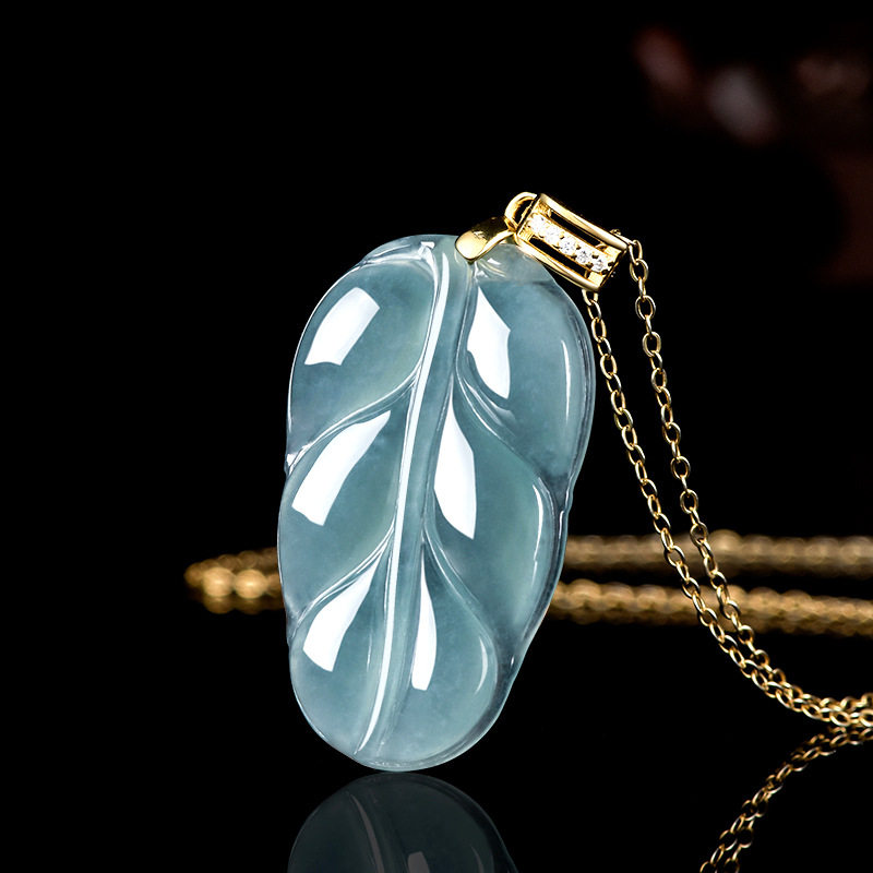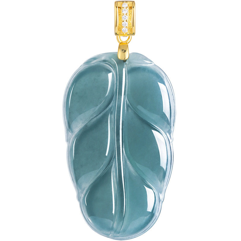 S925纯银镶天然a货翡翠蓝水树叶吊坠冰种玉石挂件18k金枝玉叶女款