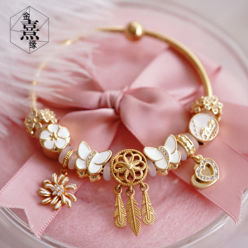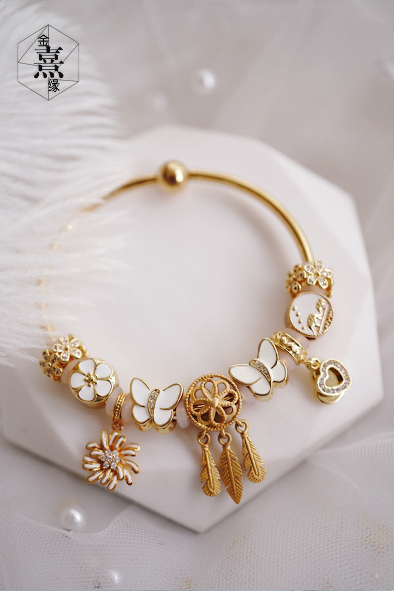 蝶恋花白色手链七夕情人节送礼可穿3d硬金diy配饰大孔散珠路路通