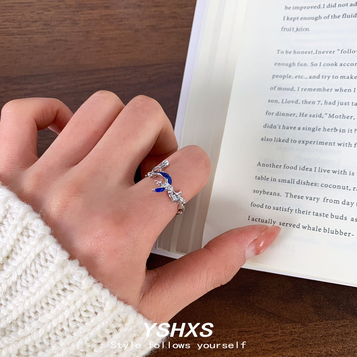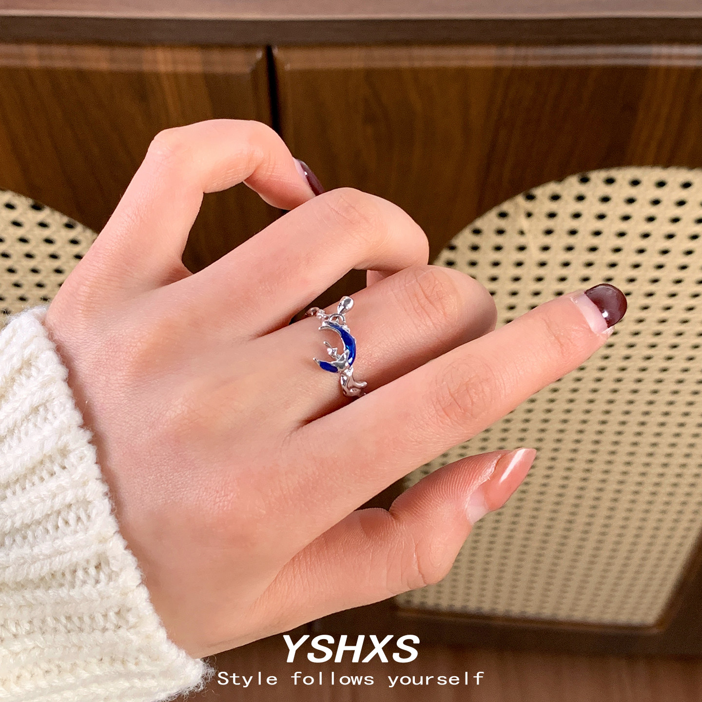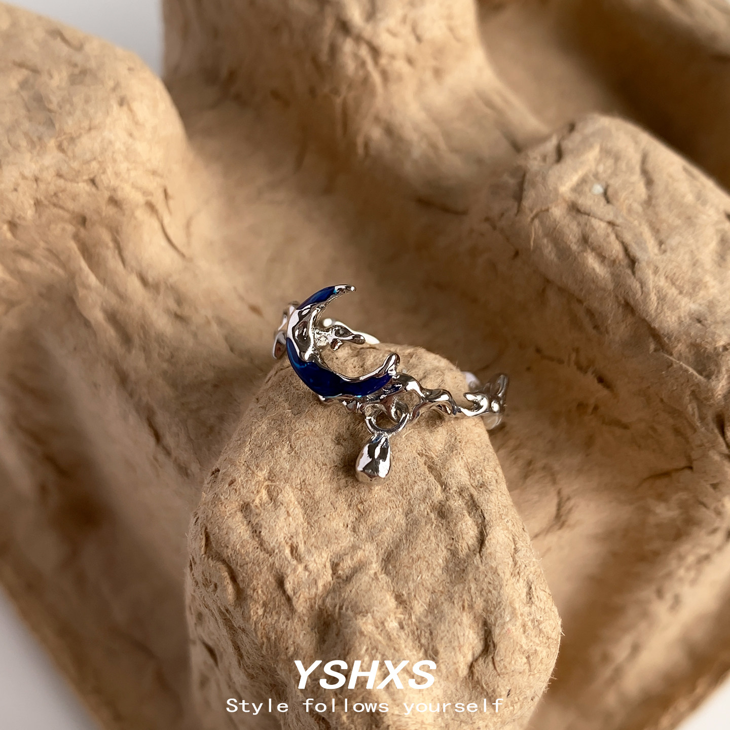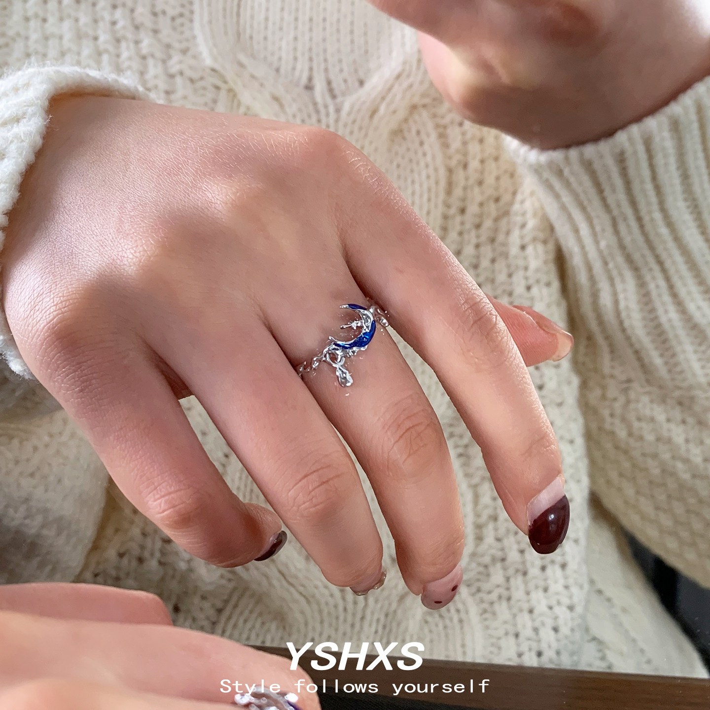 甜酷蓝色月牙少女戒指女银色轻奢高级感气质百搭开口指环