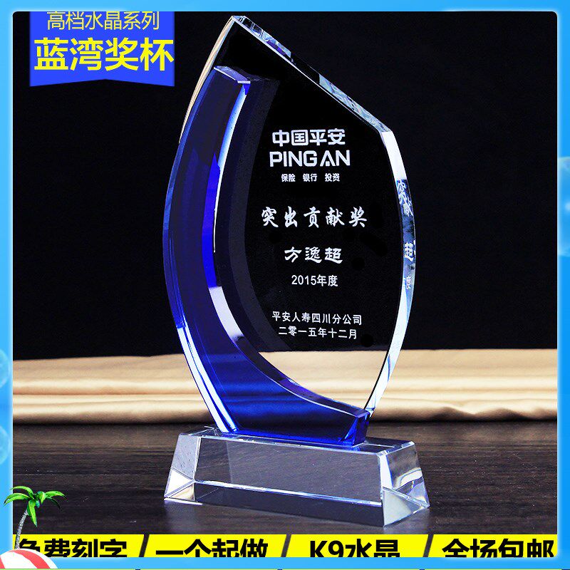 水晶奖杯奖牌创意蓝色风帆奖杯A奖牌授权牌定制免费刻字颁奖蓝湾