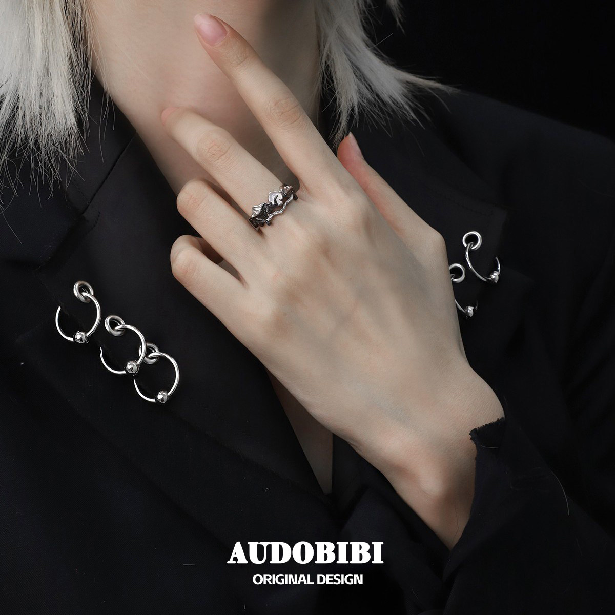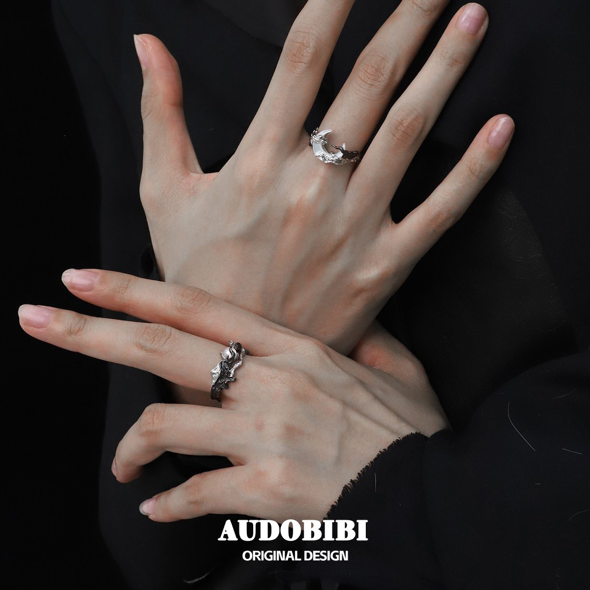 日升换月落系列 925纯银情侣戒指小众原创高级暗黑月亮白玛瑙对戒