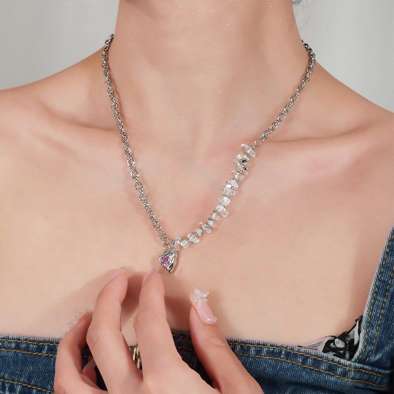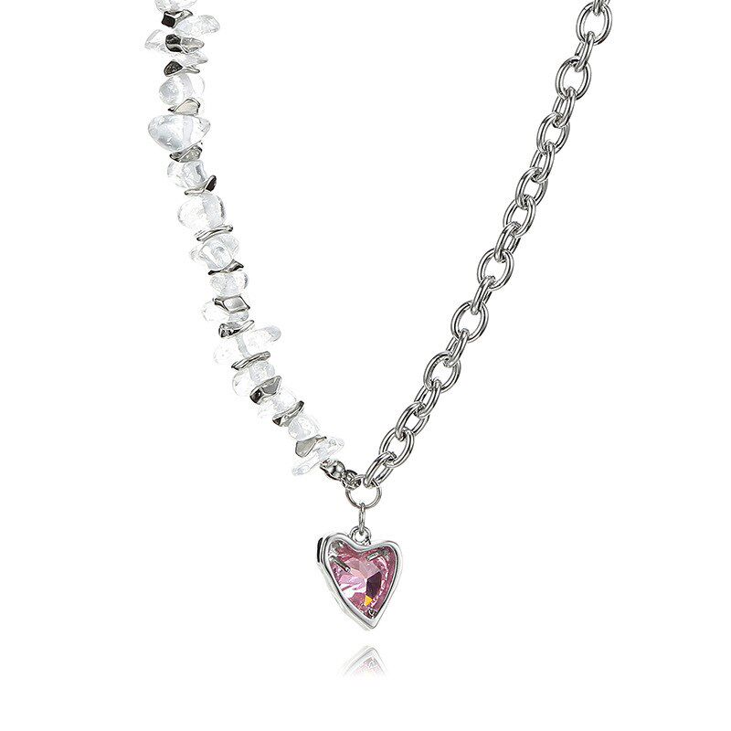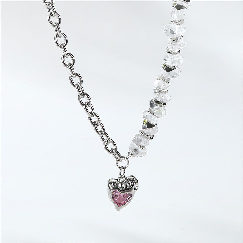 日韩新款甜美粉钻爱心吊坠拼接项链不规则白色天然石简约复古颈链