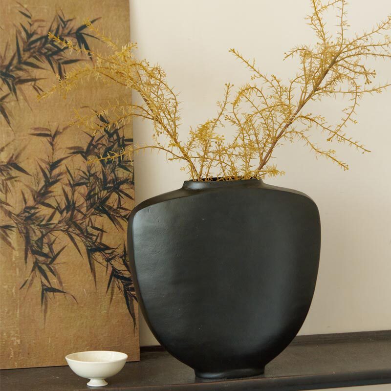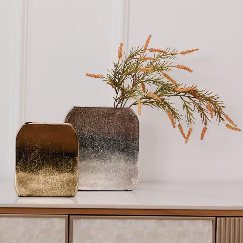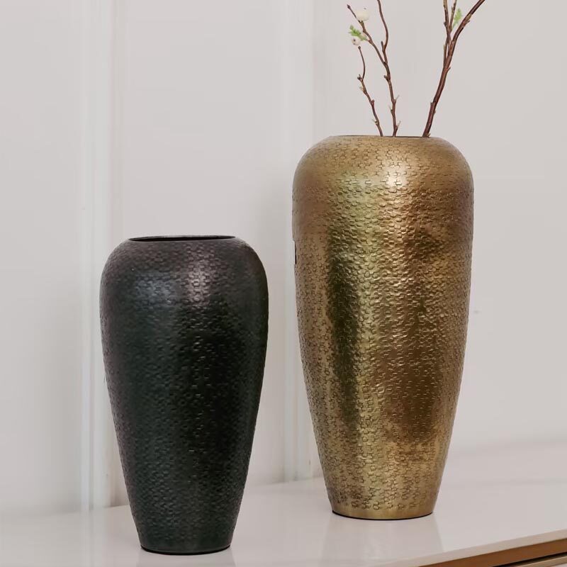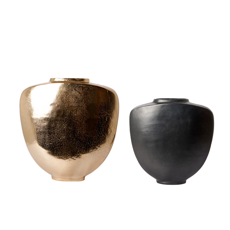 现代简约进口铝制金银色扁花瓶摆件新中式样板间酒店黑色花器装饰