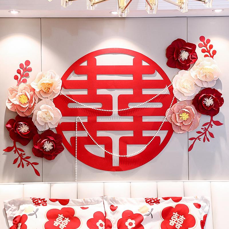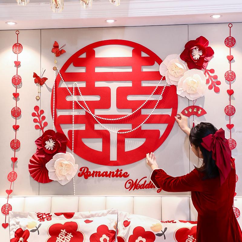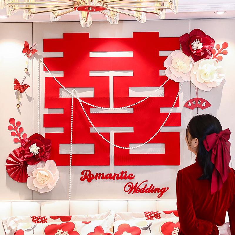 婚房布置女方卧室客厅床头背景墙珍珠装饰结婚礼新房喜字拉花套装