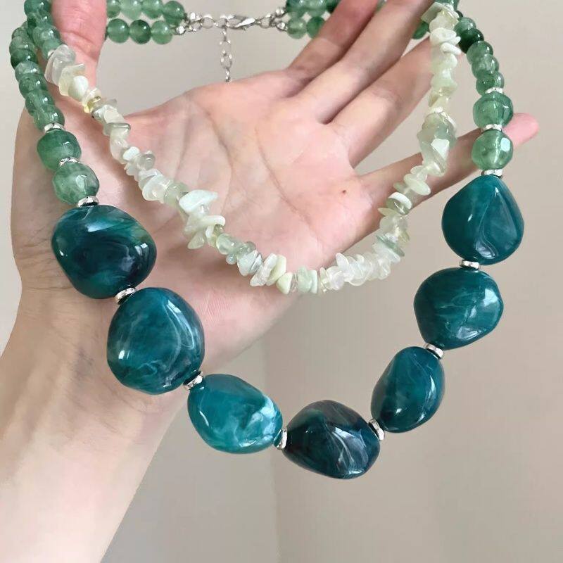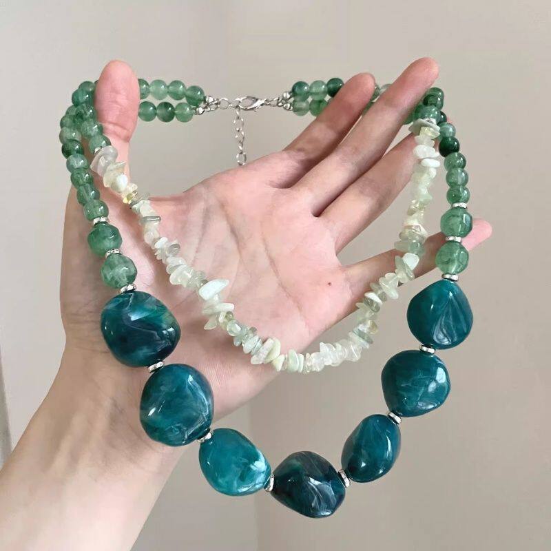 Vintage古着 Green resin beads项链绿色串珠石头双层叠戴项链