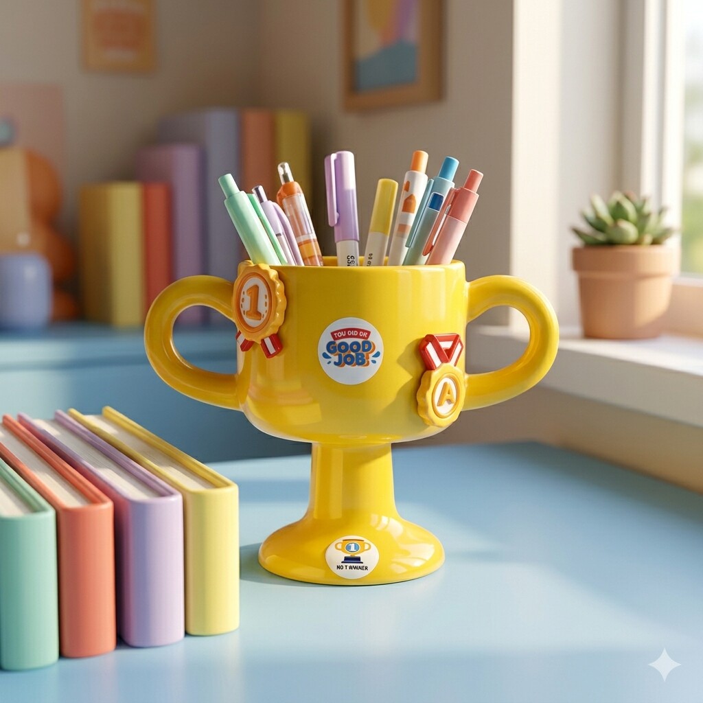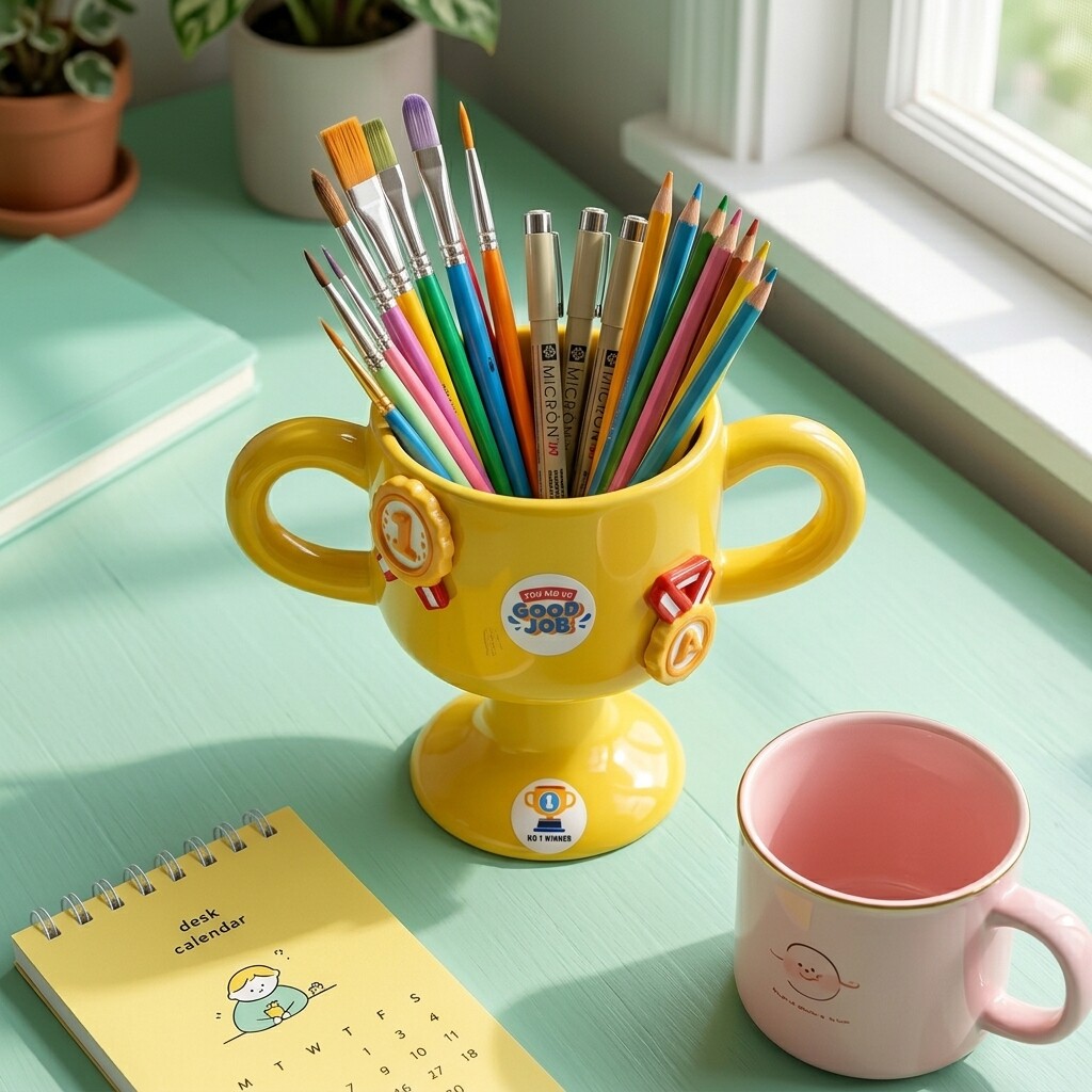 创意奖杯造型桌面收纳杯黄色双耳文具收纳盒办公室装饰摆件
