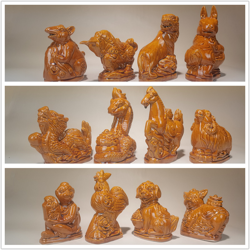 陶瓷十二生肖黄色虎牛兔羊狗鸡龙马猪摆件陶土烧制唐三彩中式动物