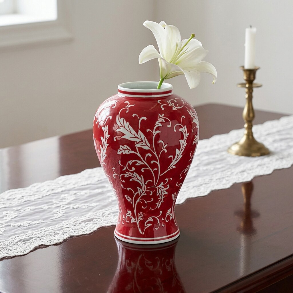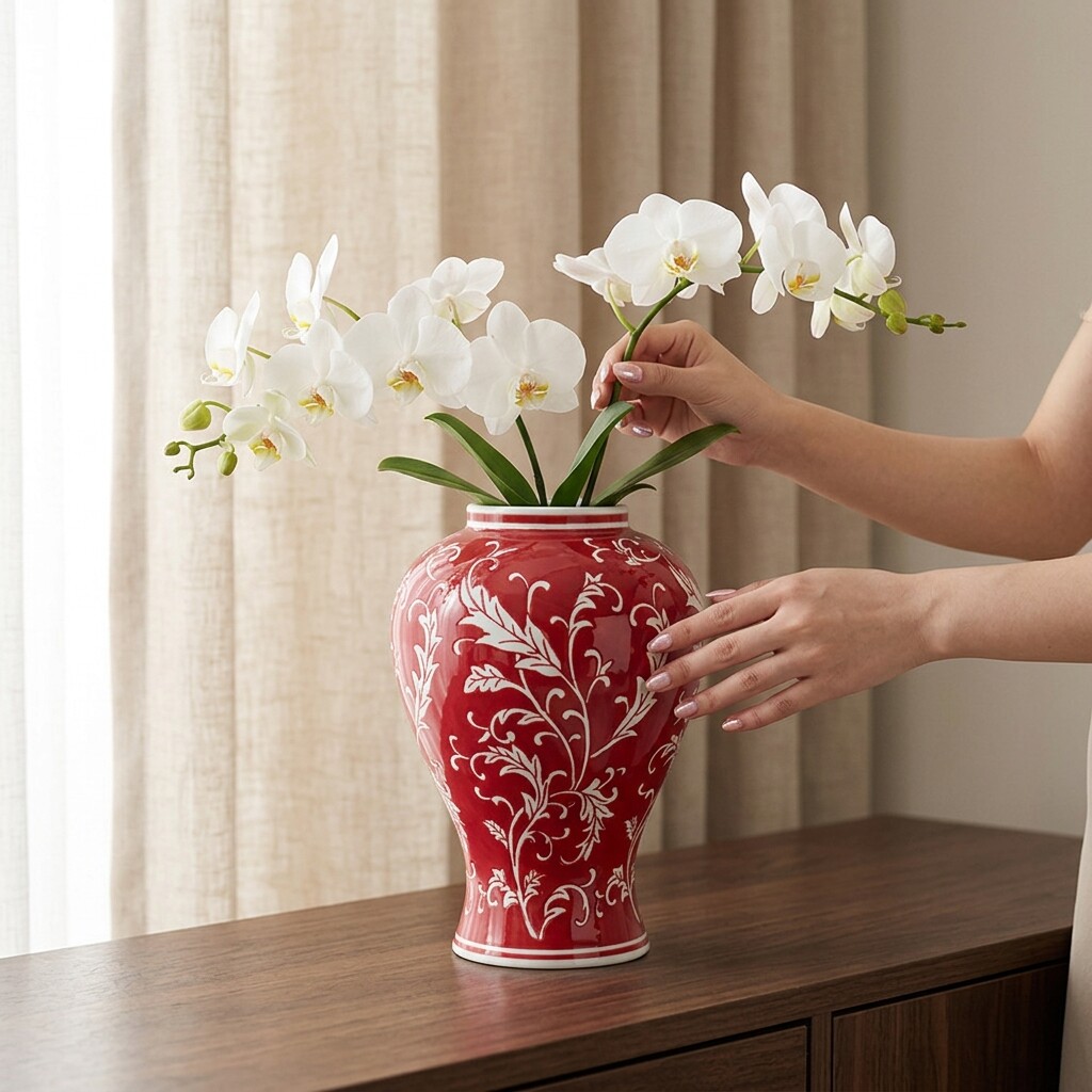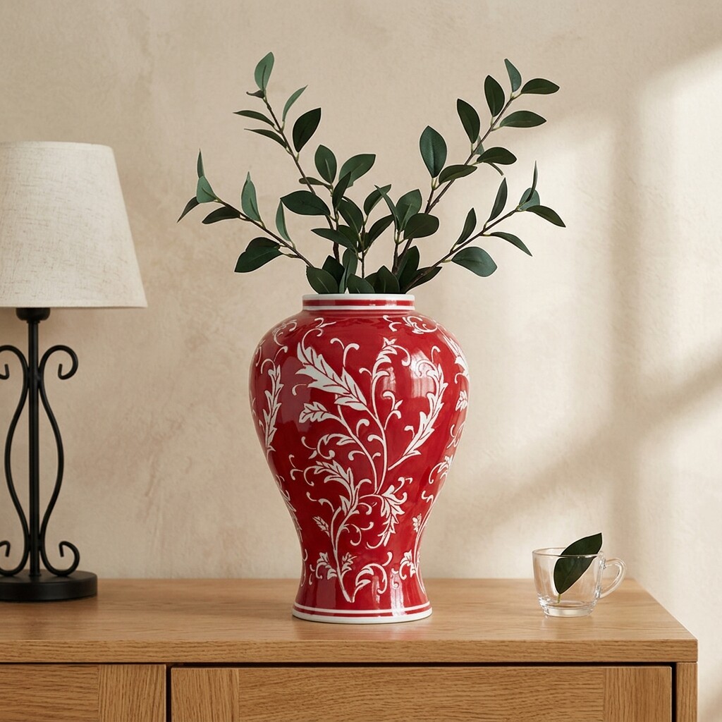 新中式陶瓷花瓶客厅装饰摆件手绘植物纹样红色国风