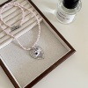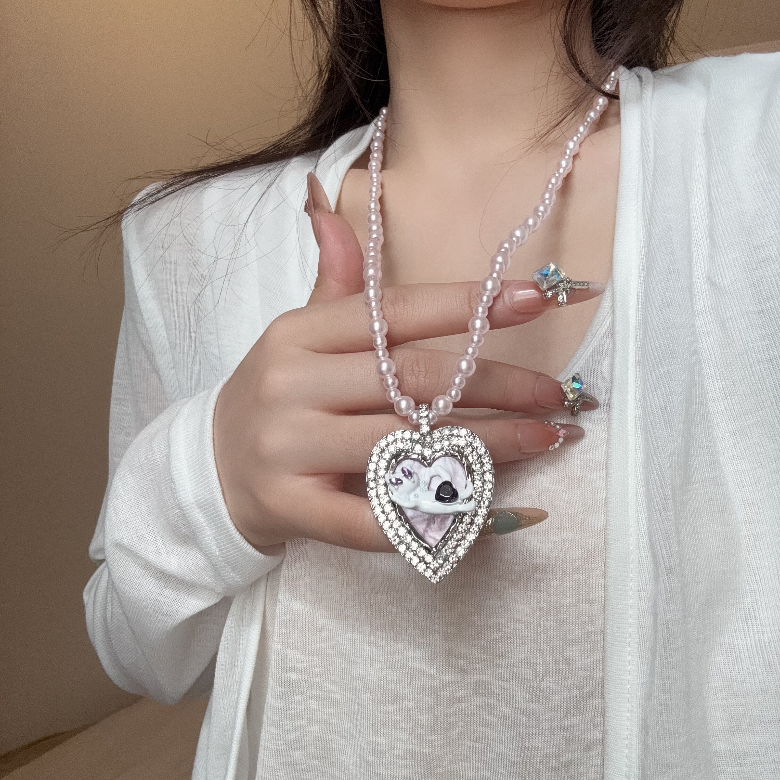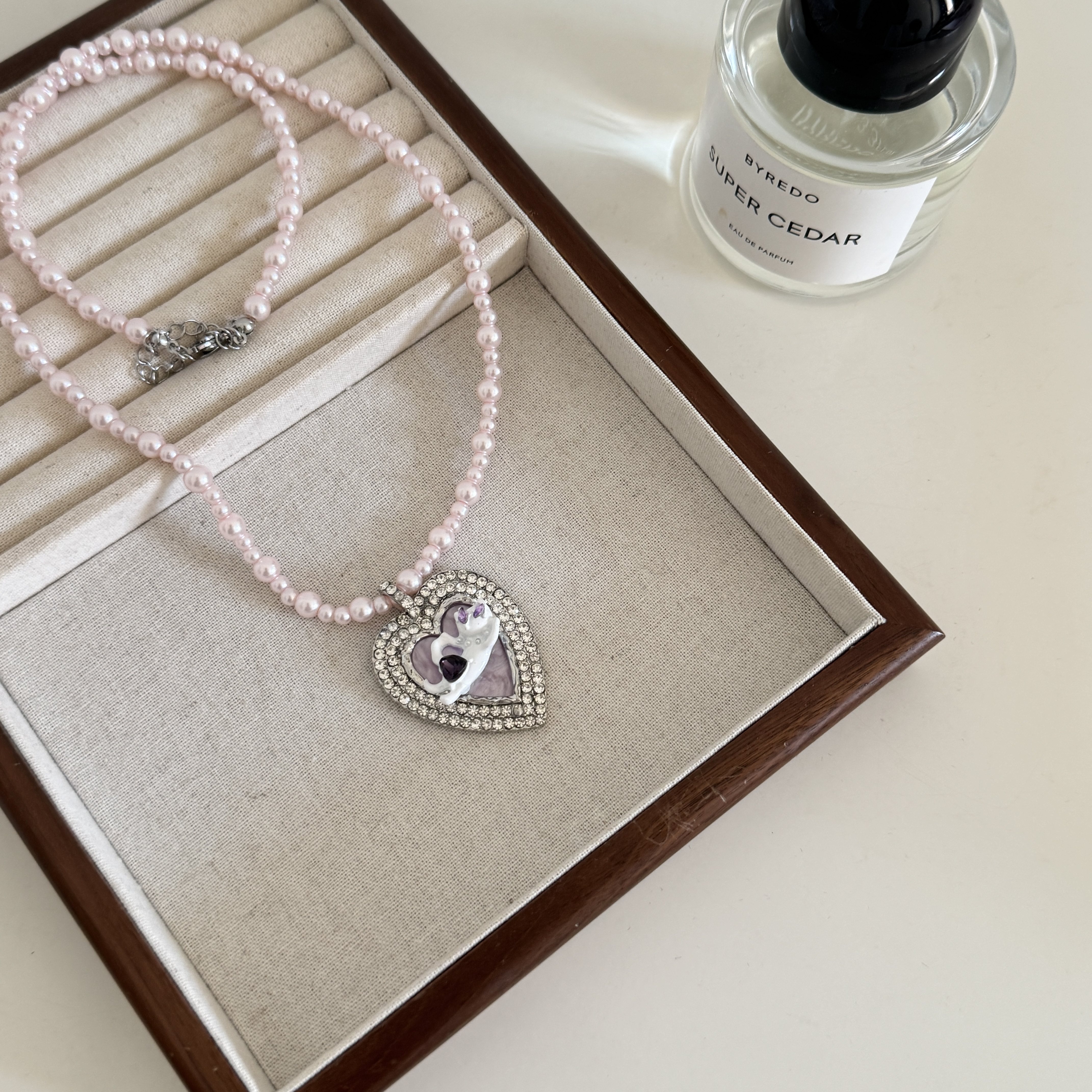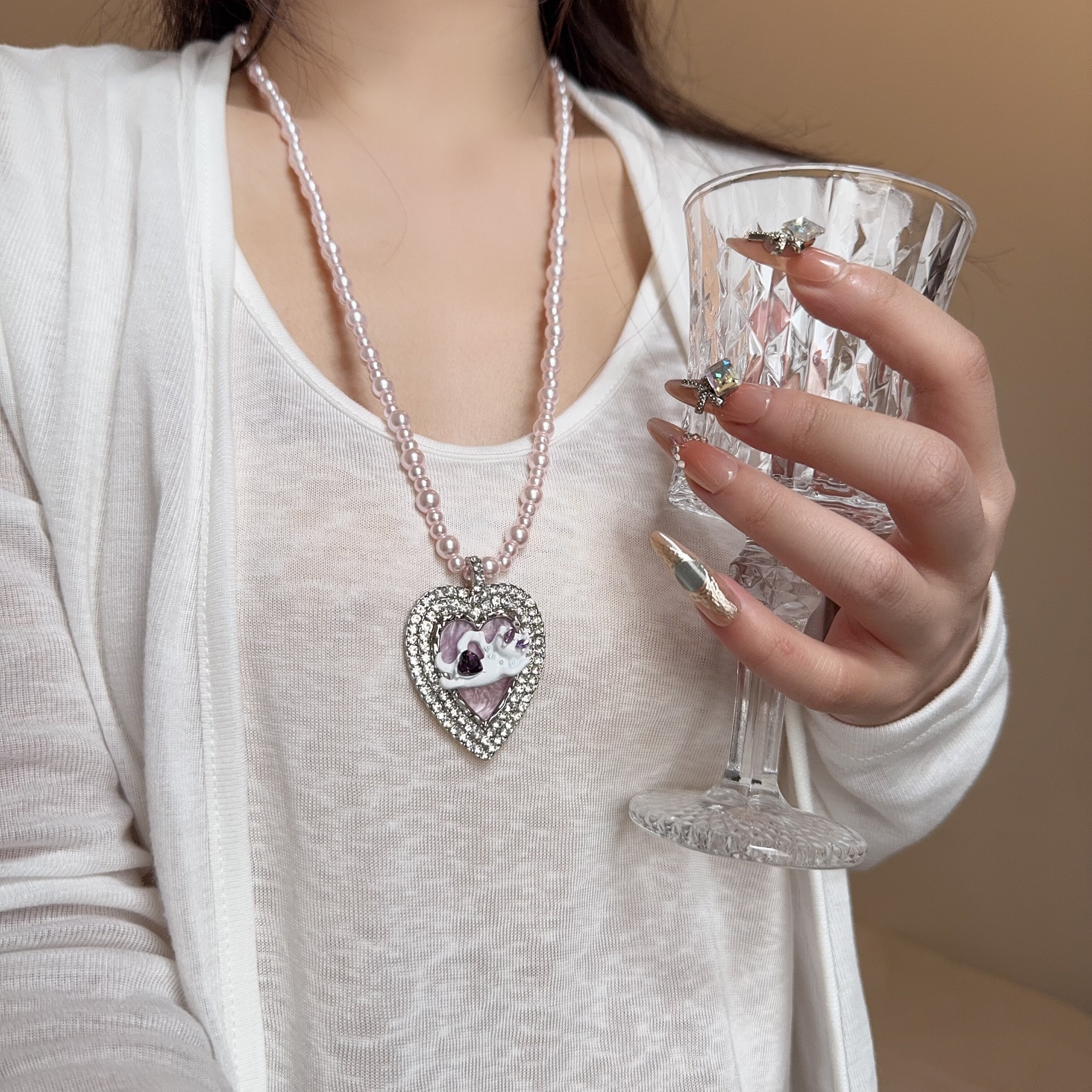 百搭猫咪紫色镶钻爱心珍珠串珠项链女韩系轻奢小众长款毛衣链颈链