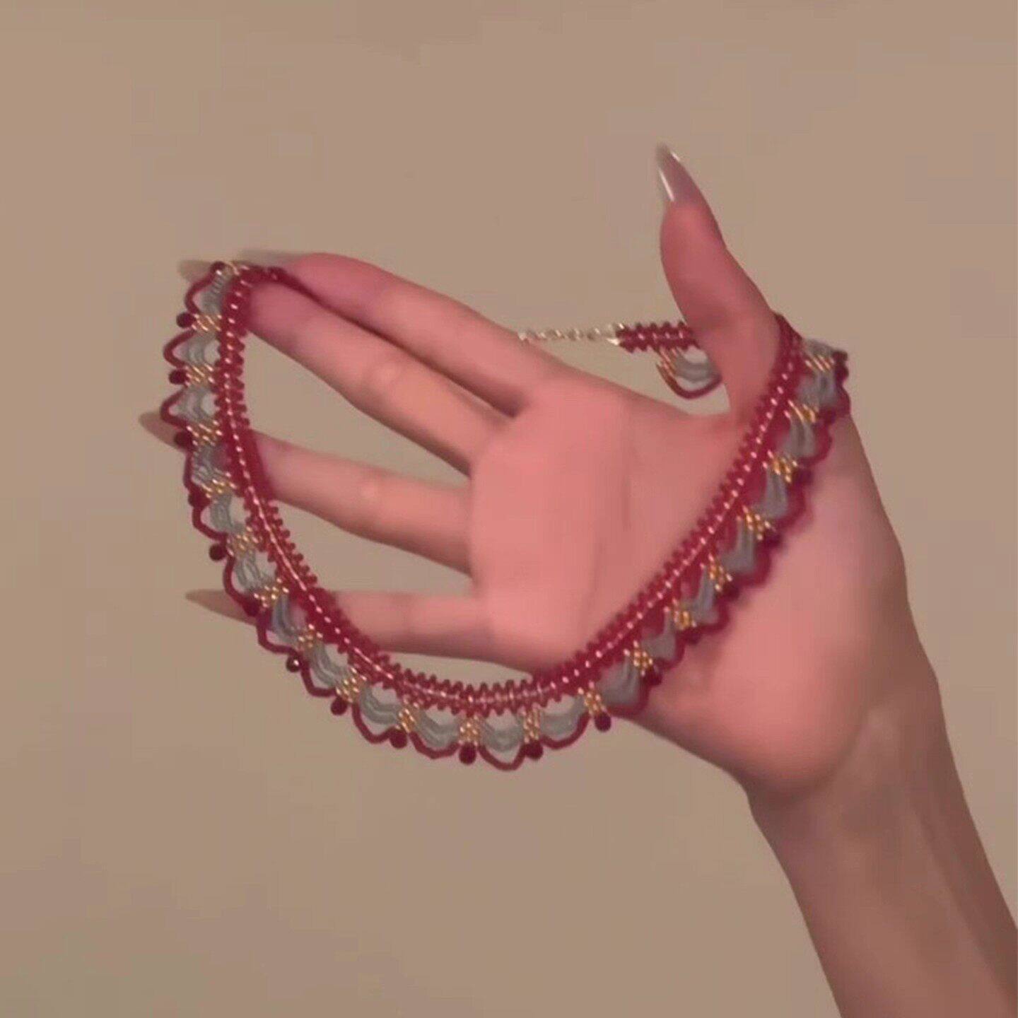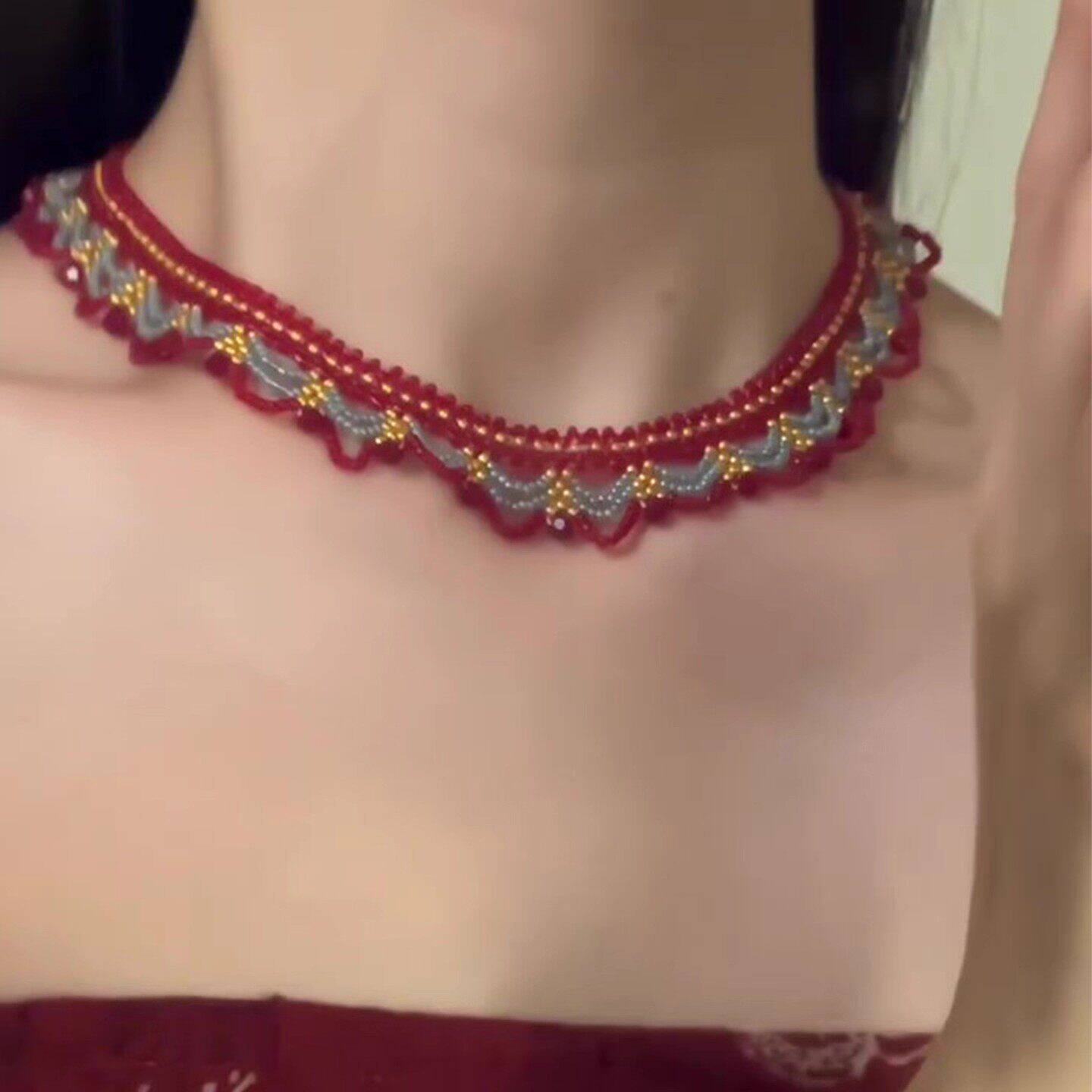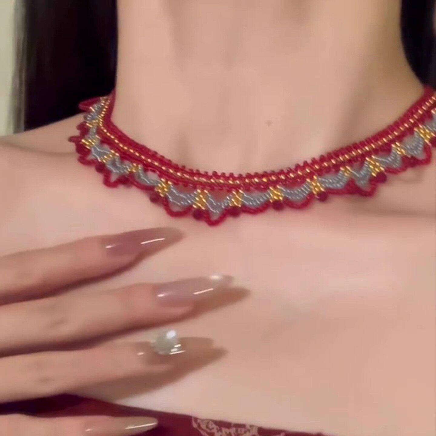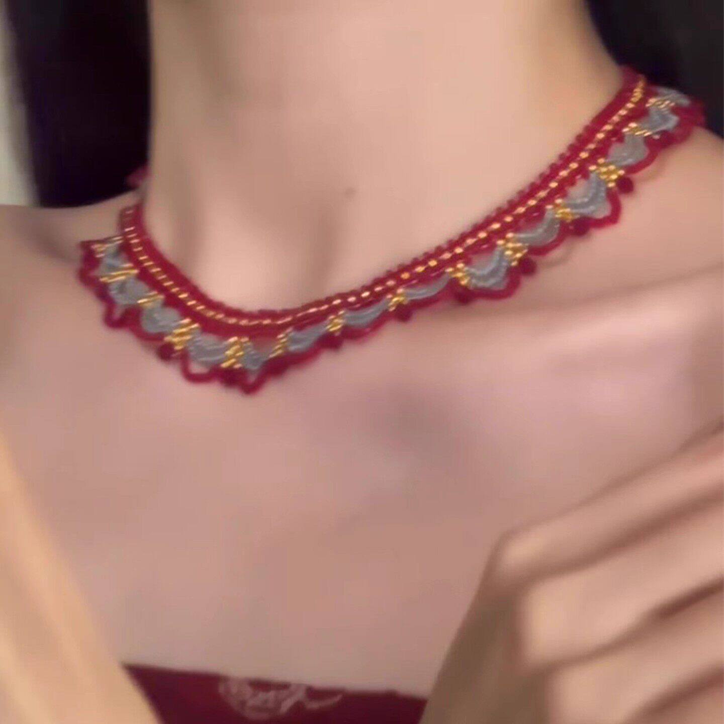 复古红色蕾丝项链女款2026新款轻奢小众设计多层叠戴锁骨颈链配饰