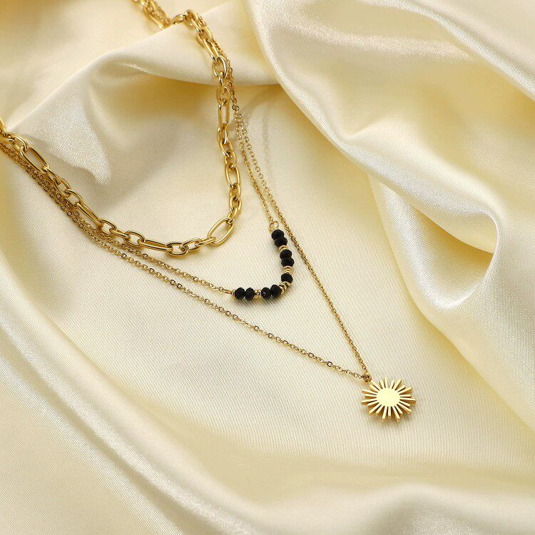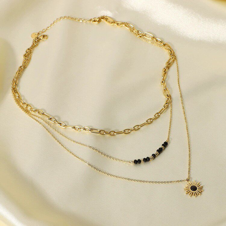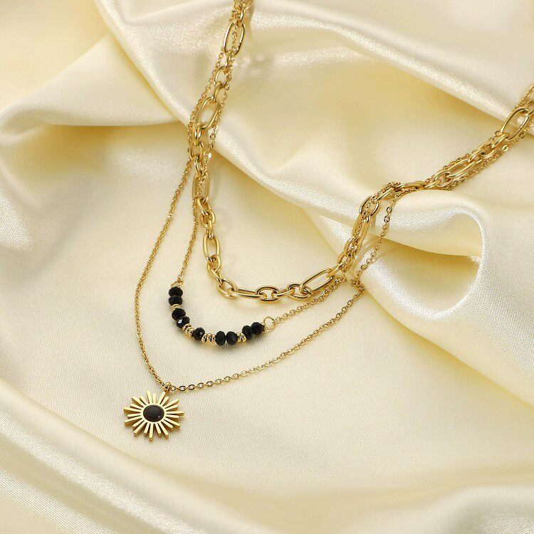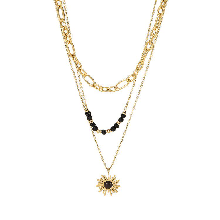 欧美INS网红同款女黑色米珠太阳花吊坠三层项链 独立包装复古项链