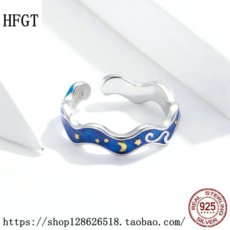 HFGT原创梵高星空S925纯银戒指女开口时尚跨境繁星蓝色欧美戒指