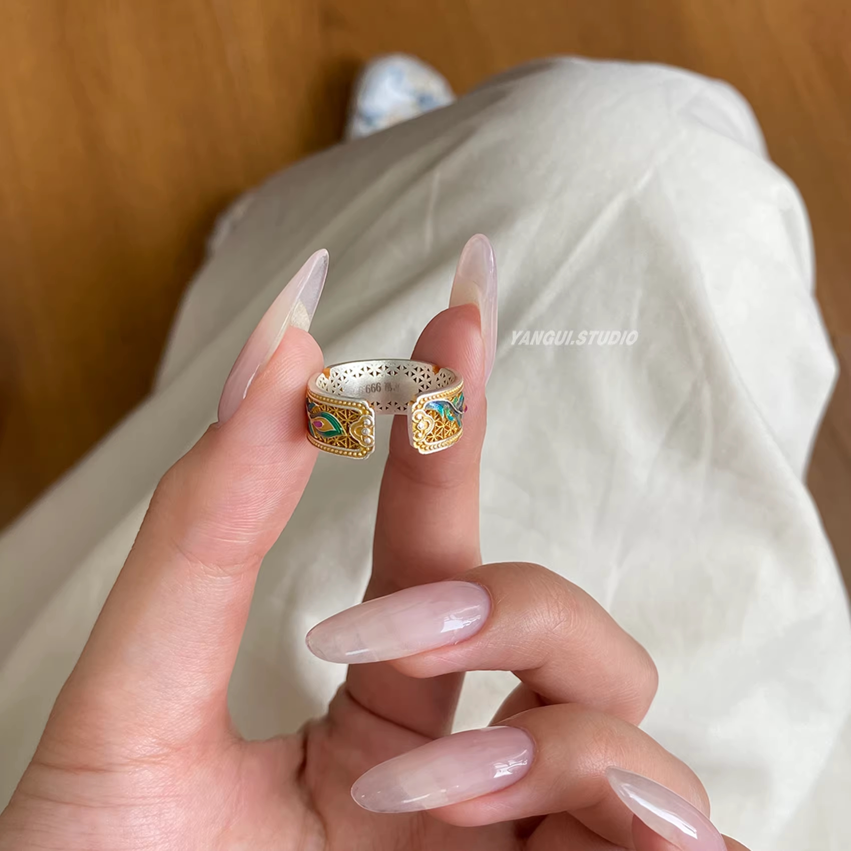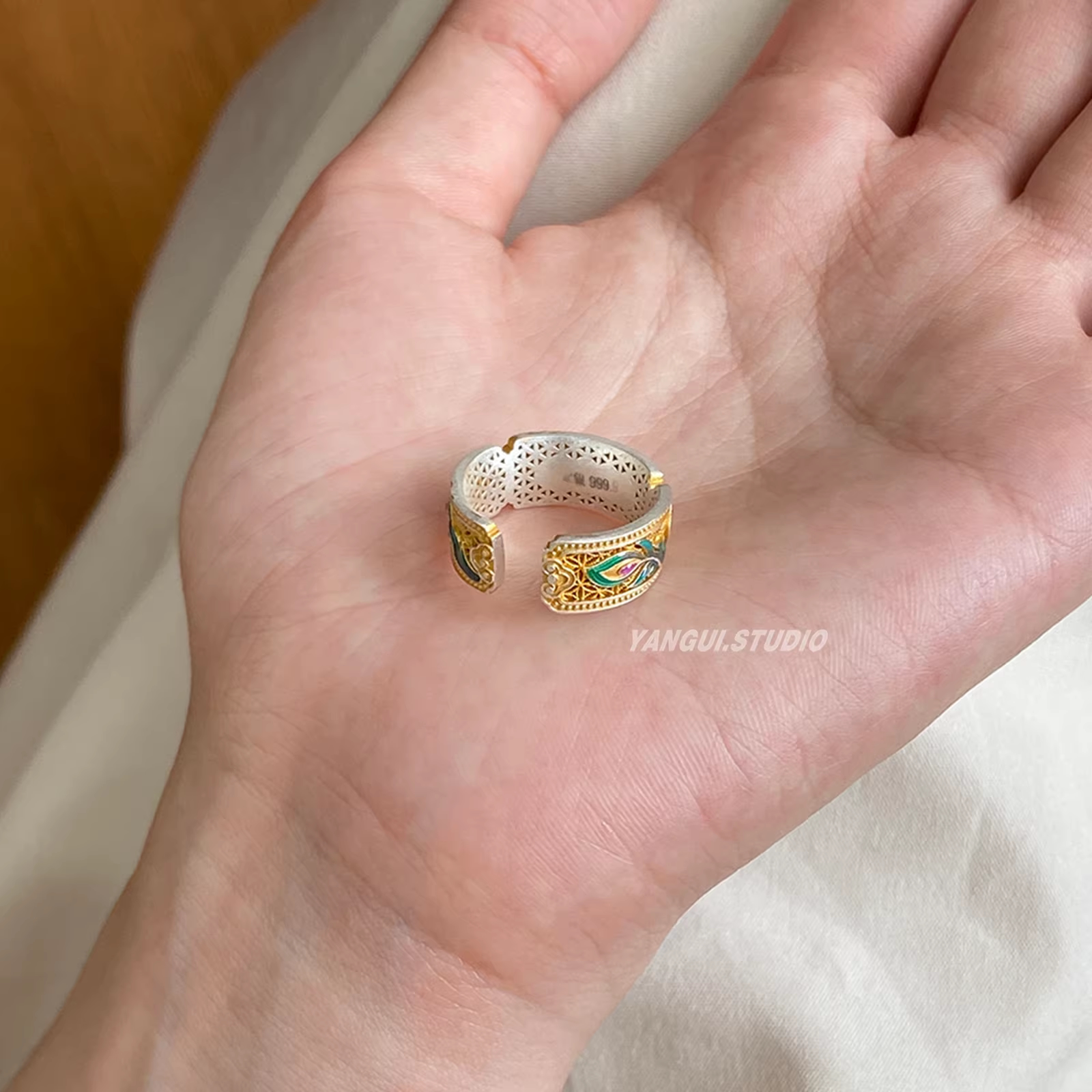9999纯银珐琅戒指女士款国风轻奢高级感描金凤羽翎指环