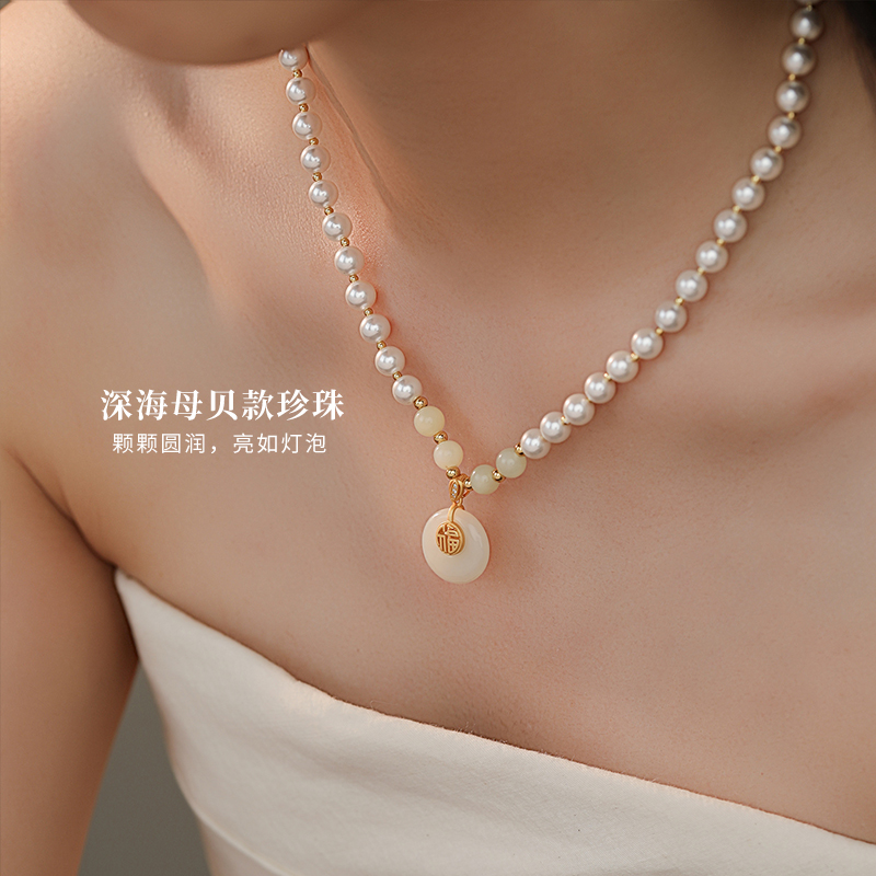 天然淡水珍珠项链妈妈款和田玉祥云吊坠颈链锁骨链秋冬配旗袍礼物