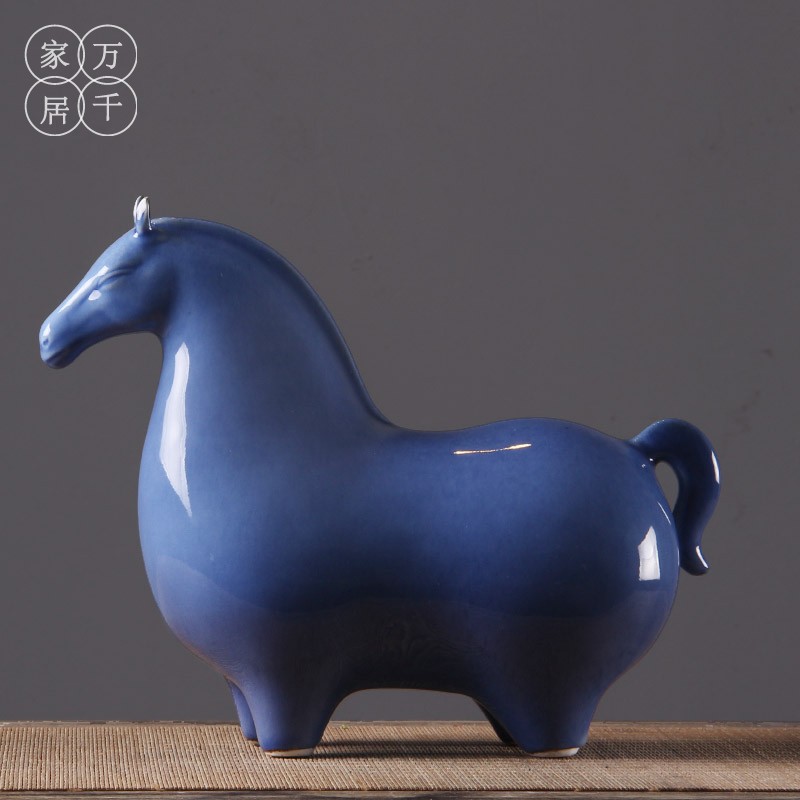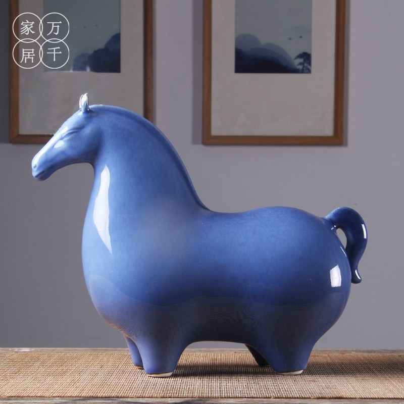 新中式蓝色釉陶瓷唐马摆件客厅电视柜博古架唐三彩动物家居装饰品