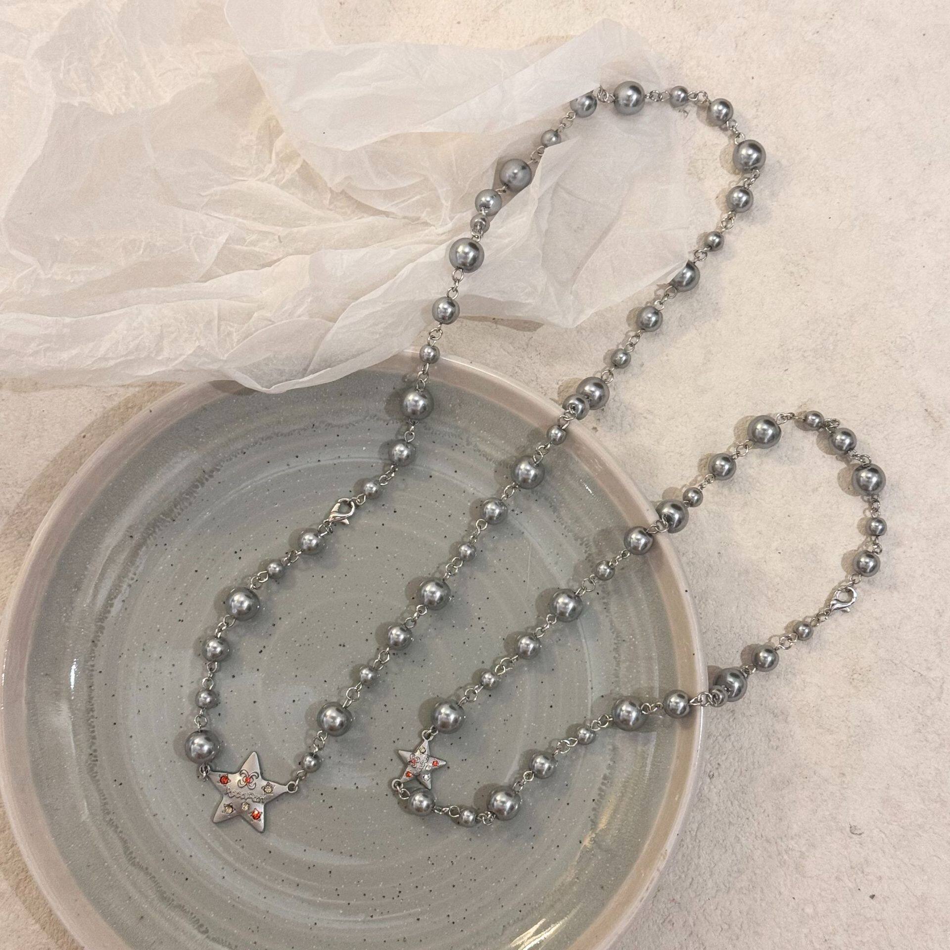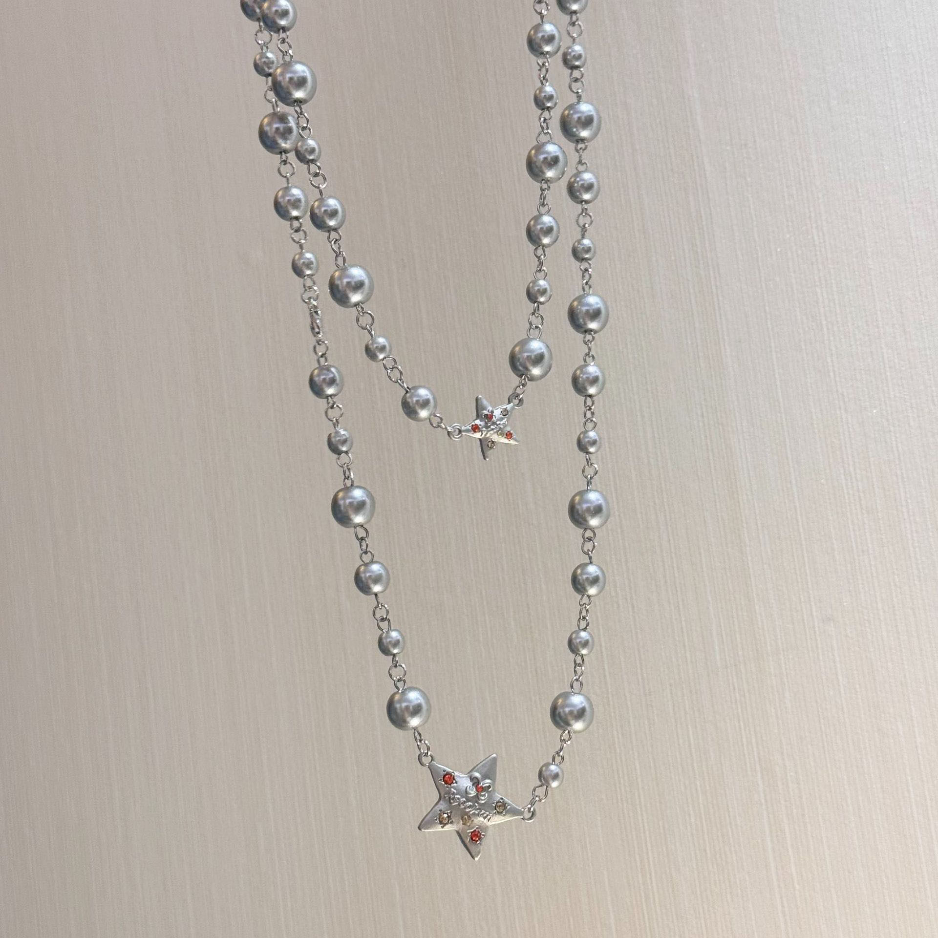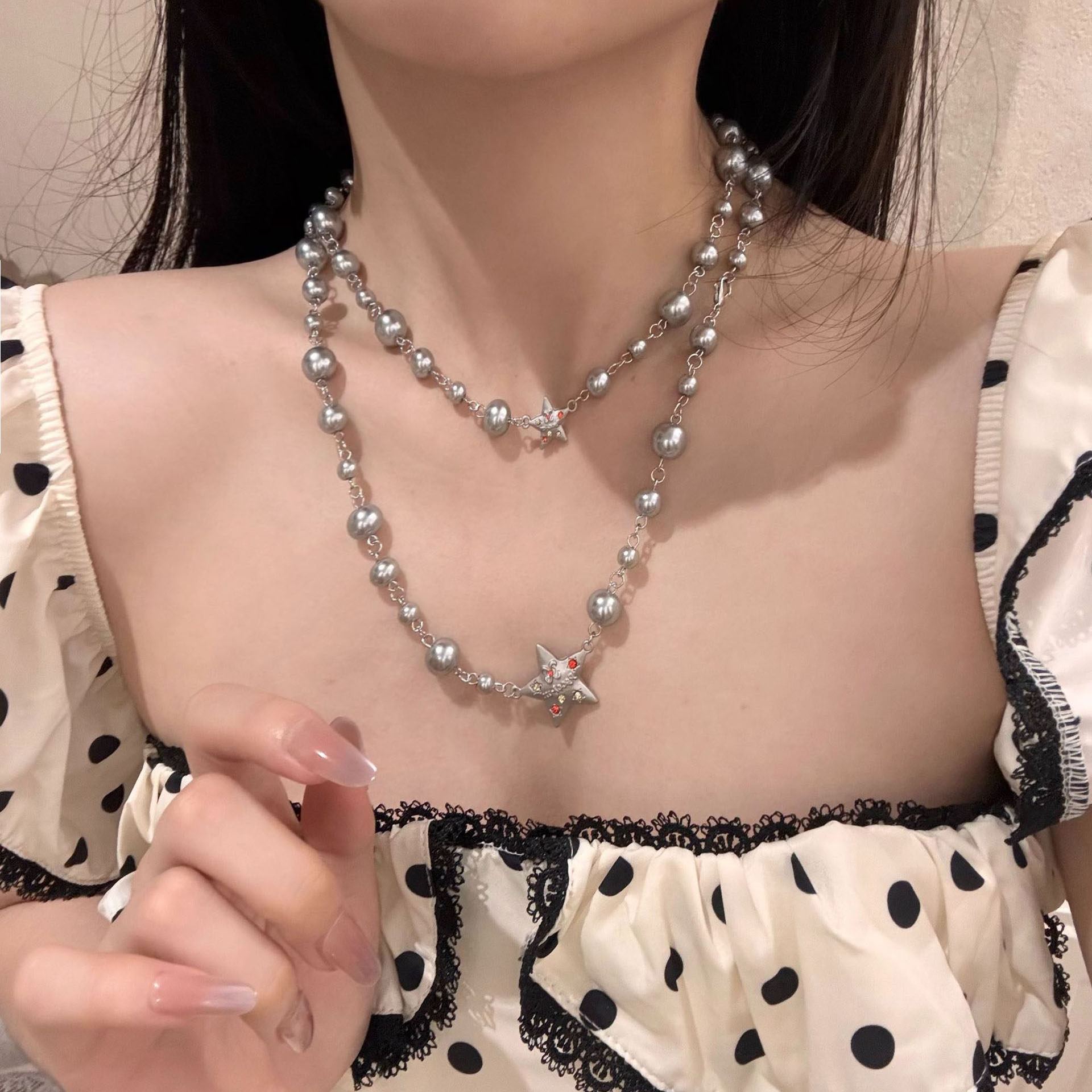 灰色珍珠双层五角星镶钻项链女轻奢叠戴大小不规则长款锁骨毛衣链