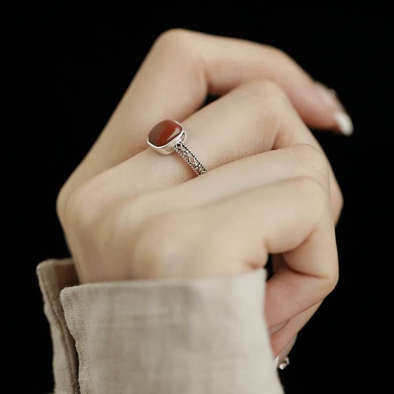 925银戒指红方糖镂空红色复古手工指环女气质简约女新年红 J10428