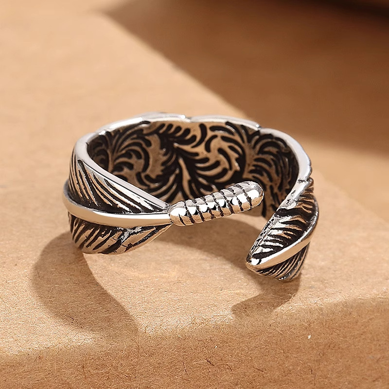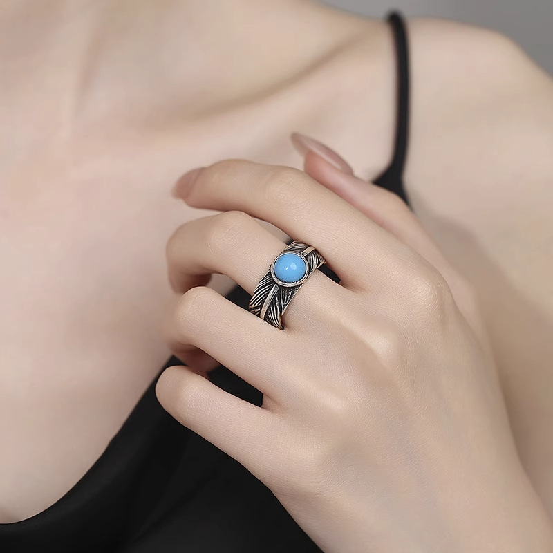 新款复古印第安蓝石羽毛男士戒指个性男女开口时尚简约饰品