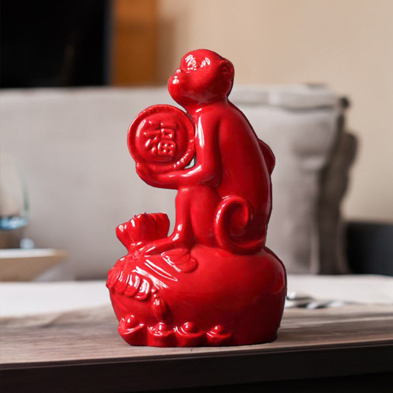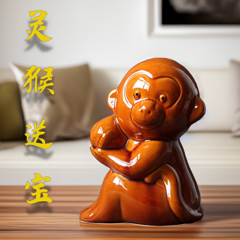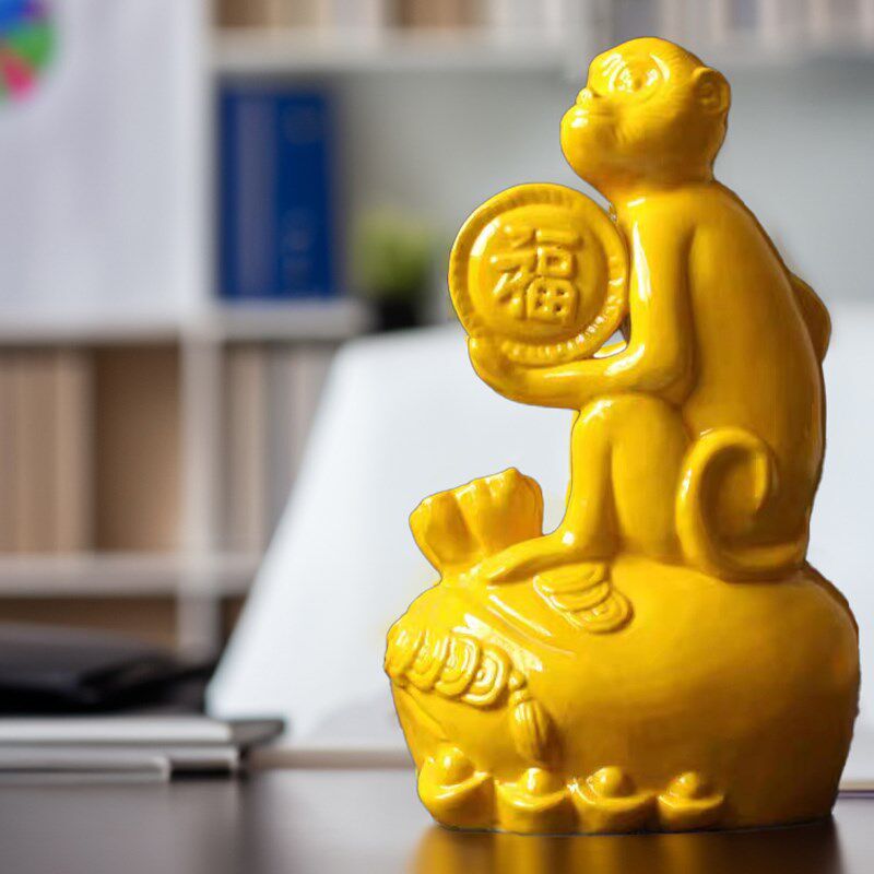 唐三彩猴子摆件陶瓷猴子十二生肖黄色猴子客厅卧室工艺品生日礼物