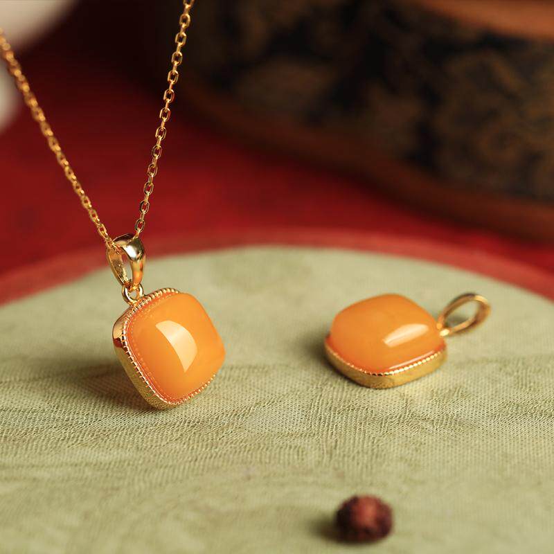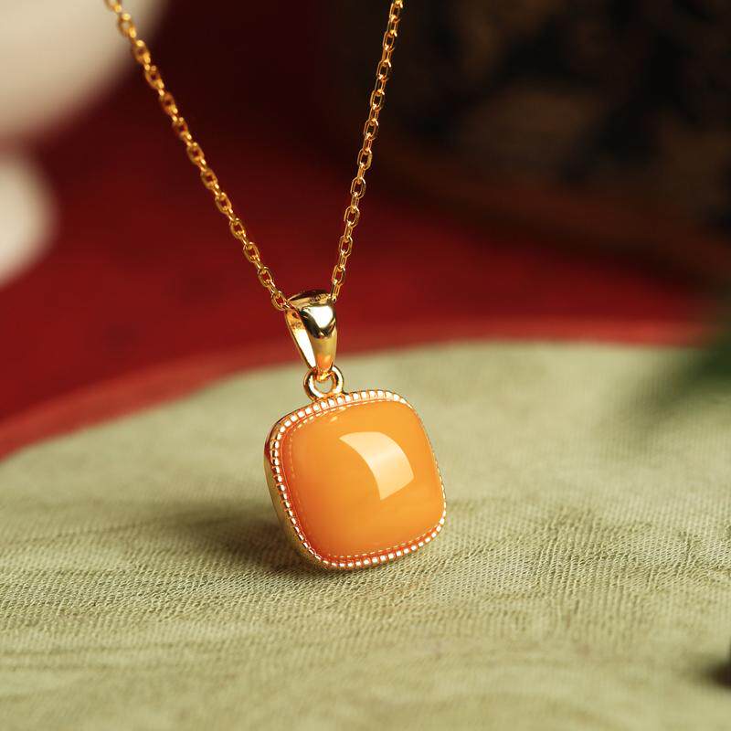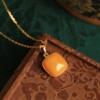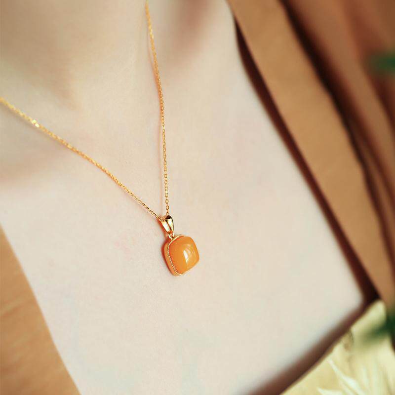 天然蜜蜡纯银方糖吊坠女高级黄色玉石琥珀金镶玉无事牌锁骨链项链