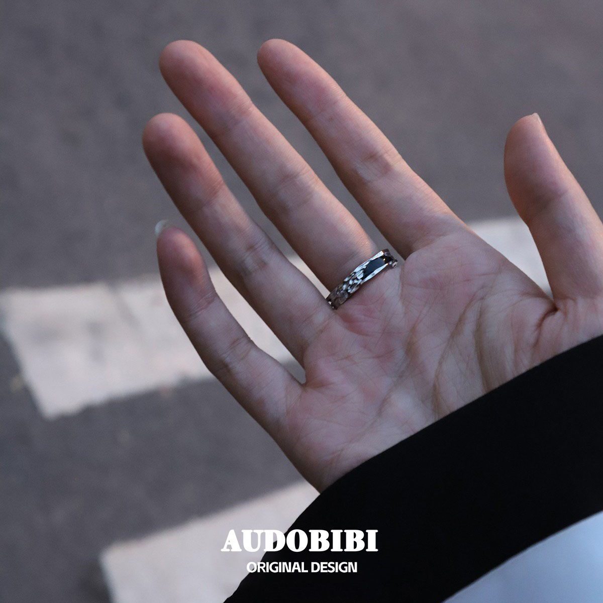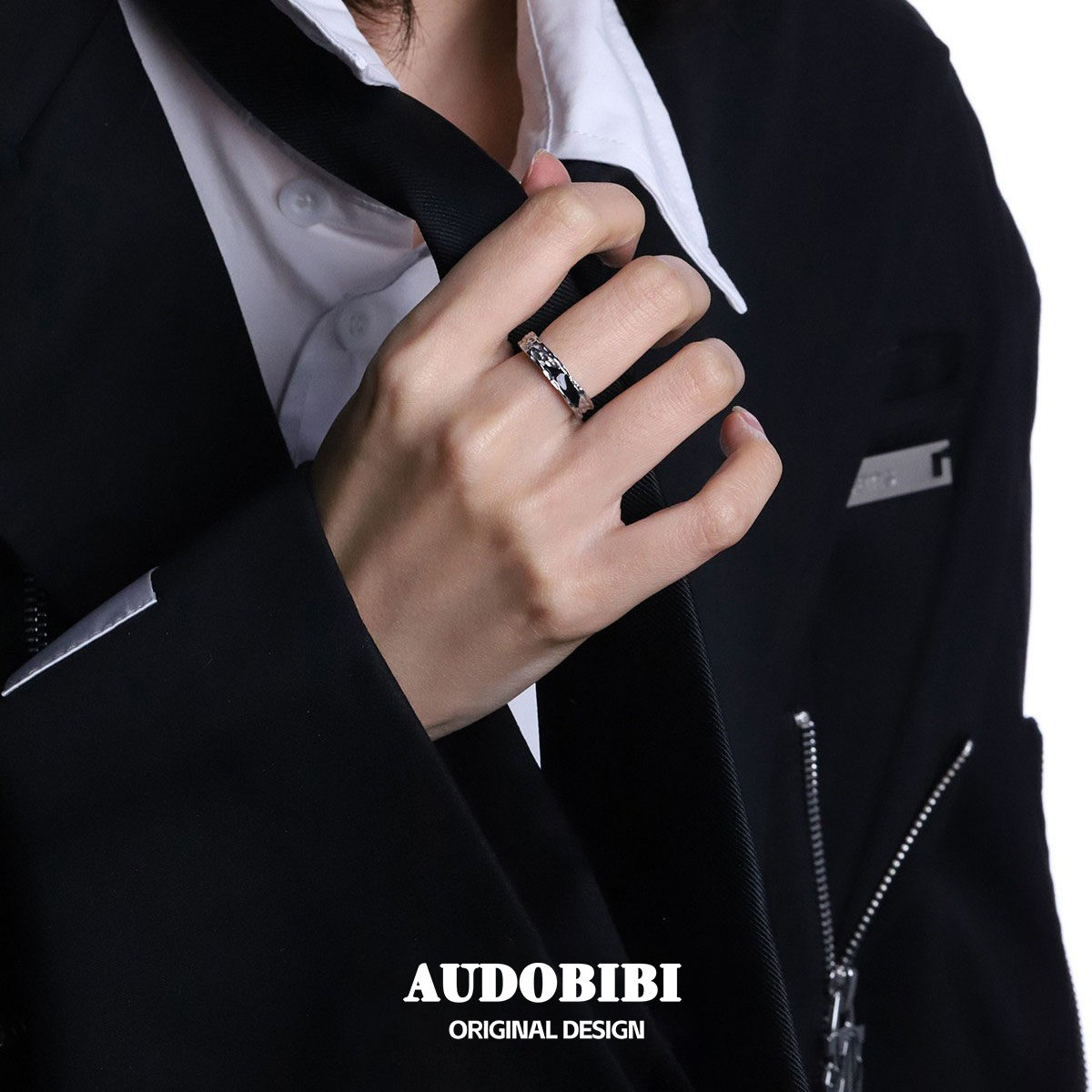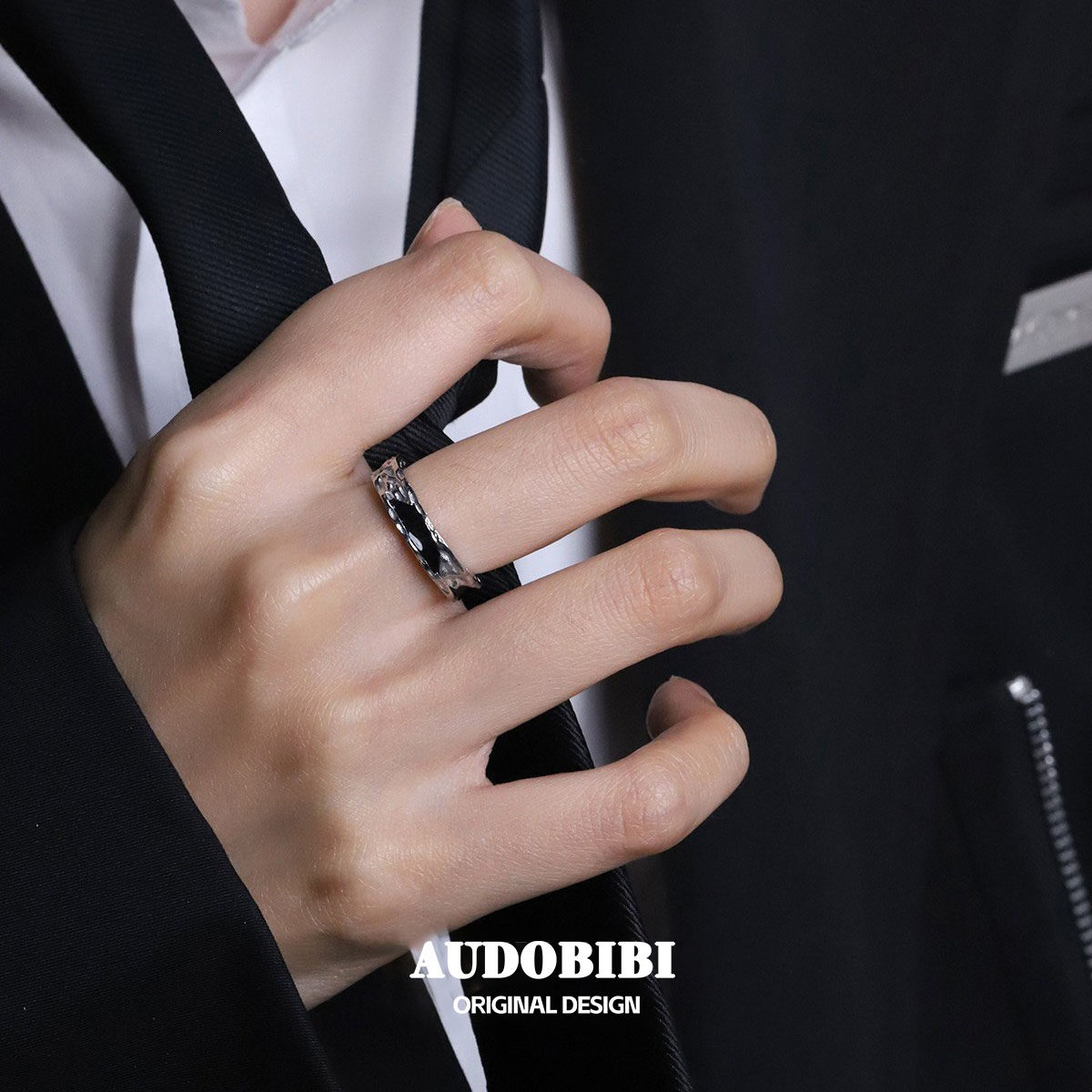 原创设计小众纯银黑色开口戒指可调暗黑冷淡风镶钻食指戒情侣对戒