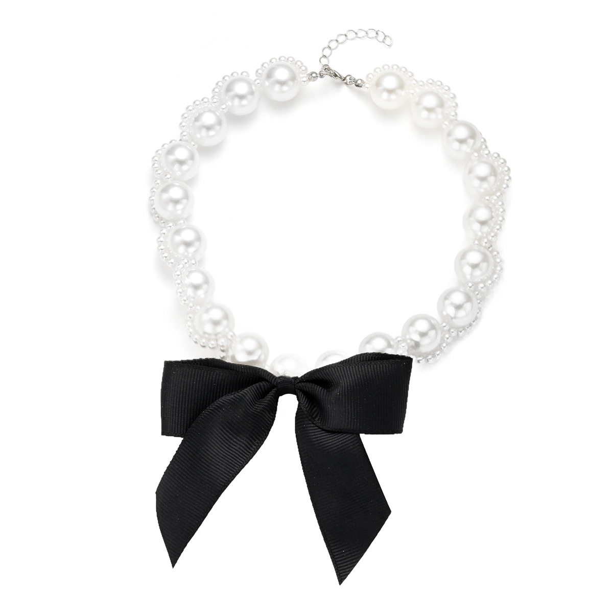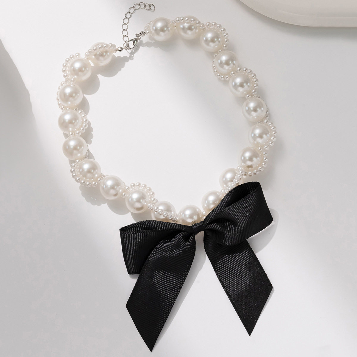法式复古黑色蝴蝶结丝带缠绕珍珠项链气质锁骨链新娘婚纱礼服配饰