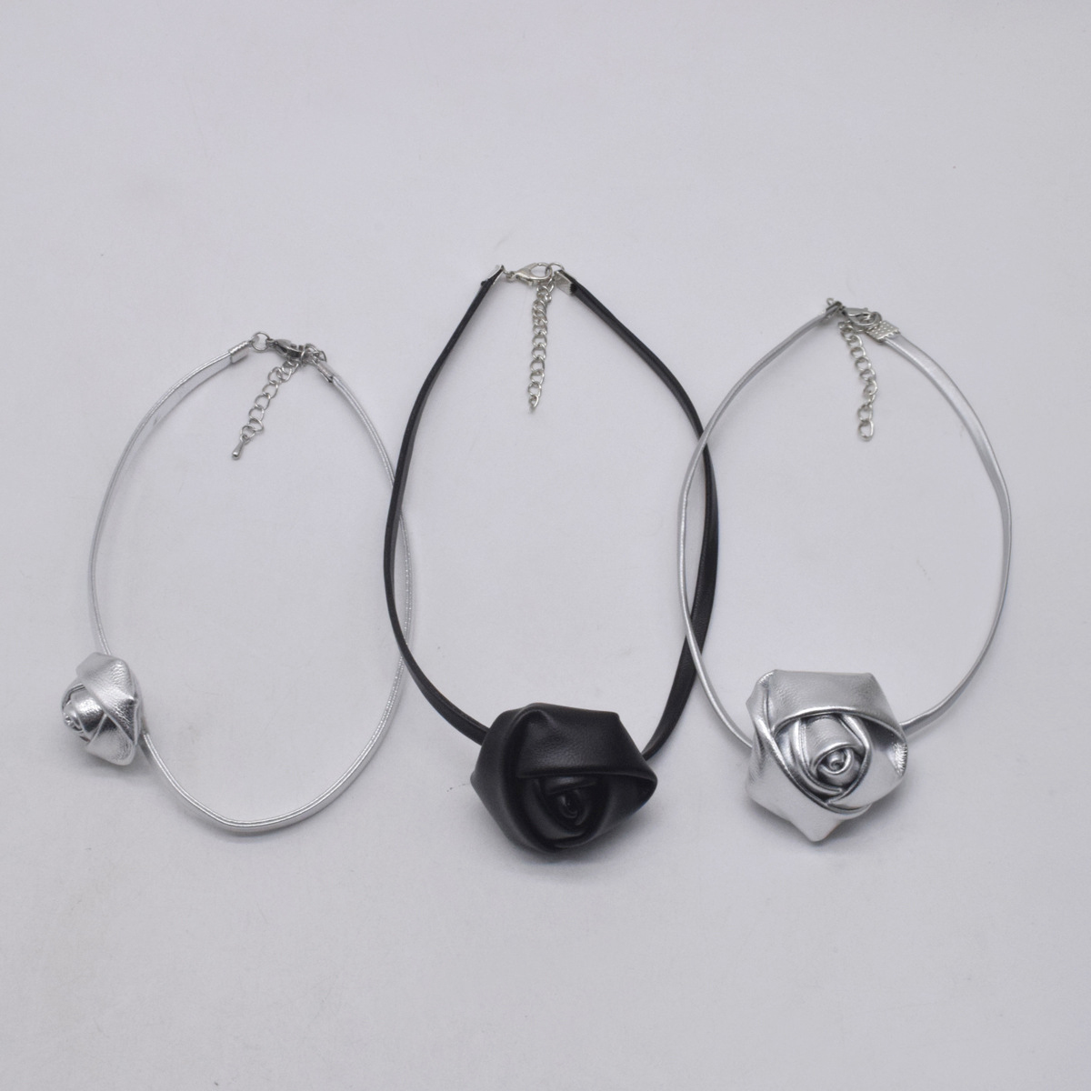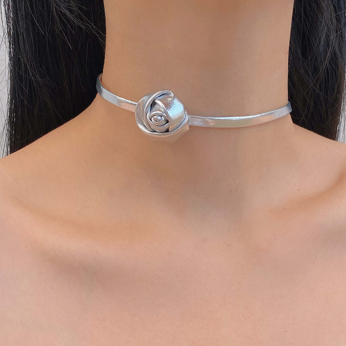 复古银黑色玫瑰花皮革项链女小众冷淡风choker甜酷辣妹锁骨链颈链