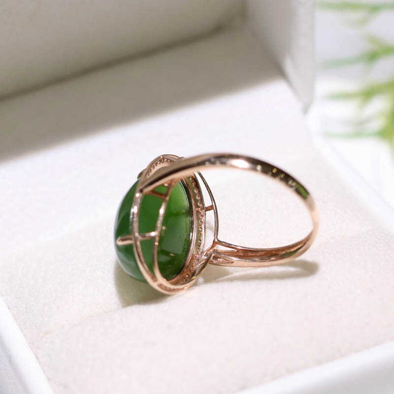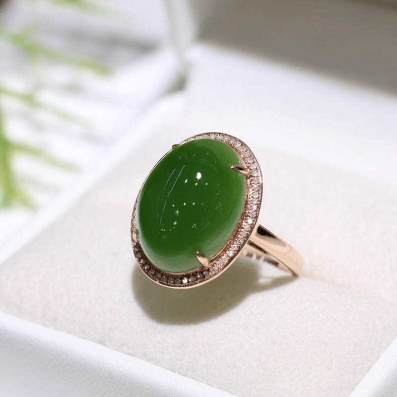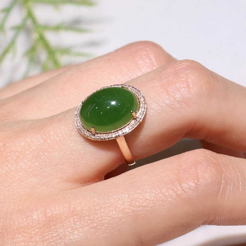 中秋礼物18K金镶玉满钻碧玉戒指女a高档轻奢满钻和田玉指环送老婆