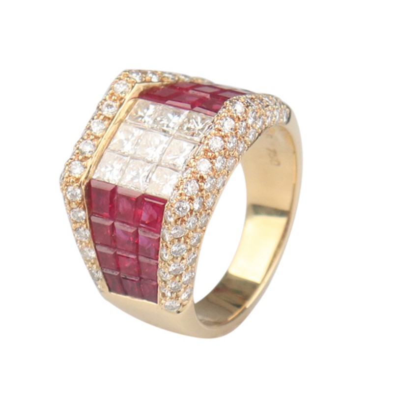【自营】中古95新日本进口商品奢华群镶公主方形钻石红宝石戒指