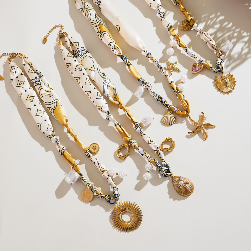 欧美高端INS海洋风贝壳海星镶锆石项链 多配件钛钢丝带布艺项链女