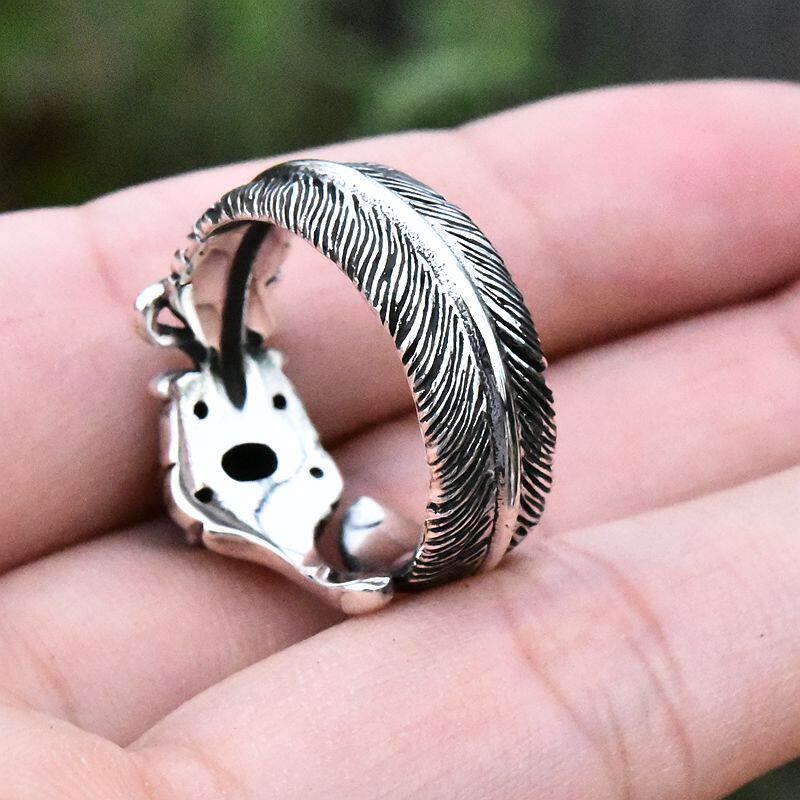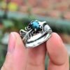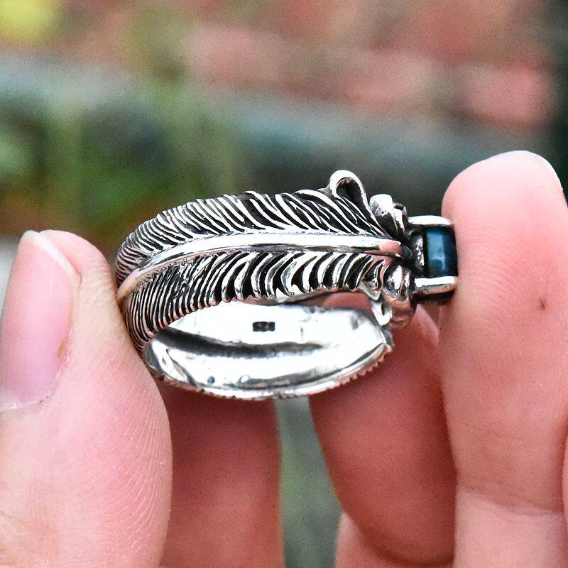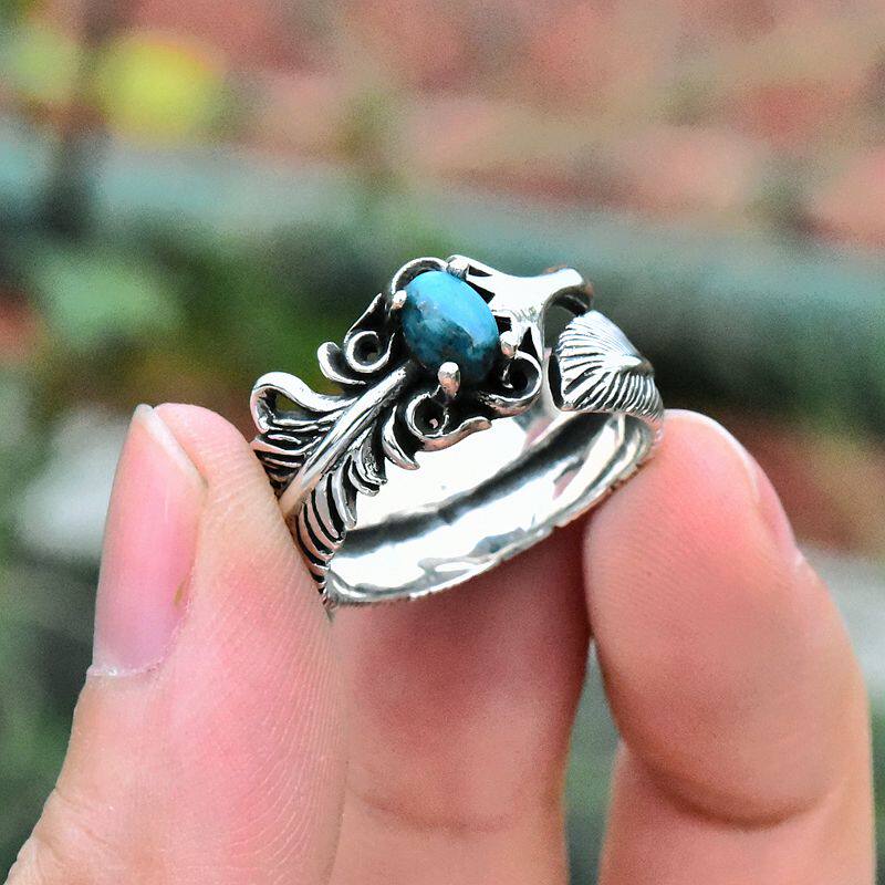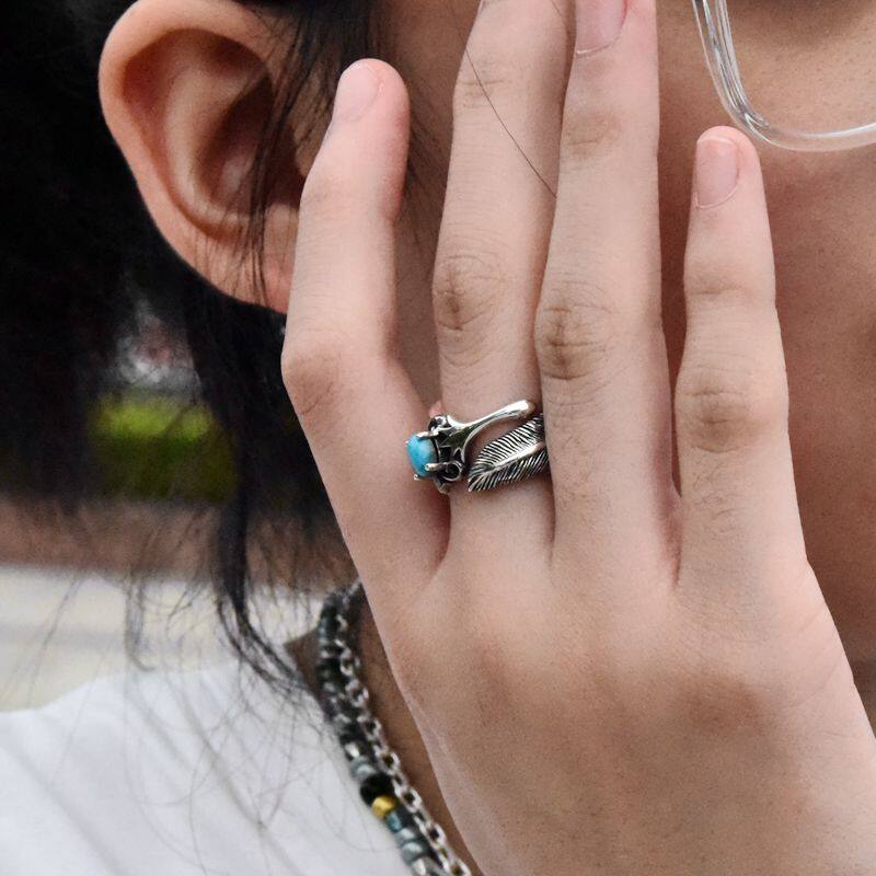 男女复古镶嵌天然高瓷绿松石开口泰银戒指925纯银印第安羽毛指环