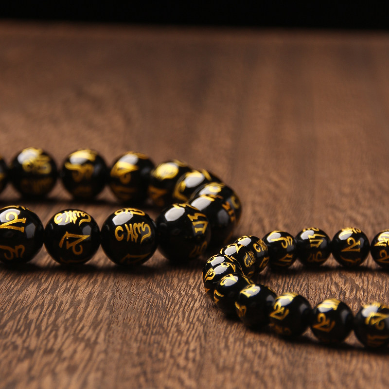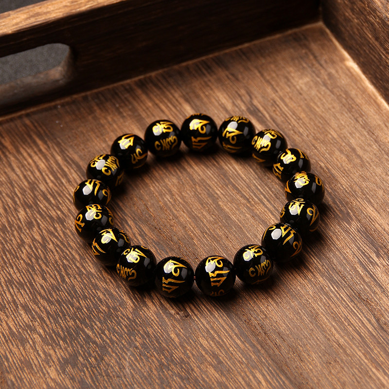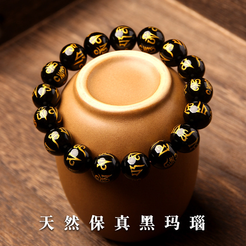 玛瑙六字真言手链天然水晶手串黑色珠子佛珠箴言珠子饰品礼物正品