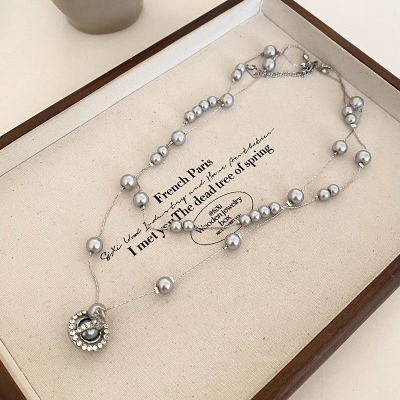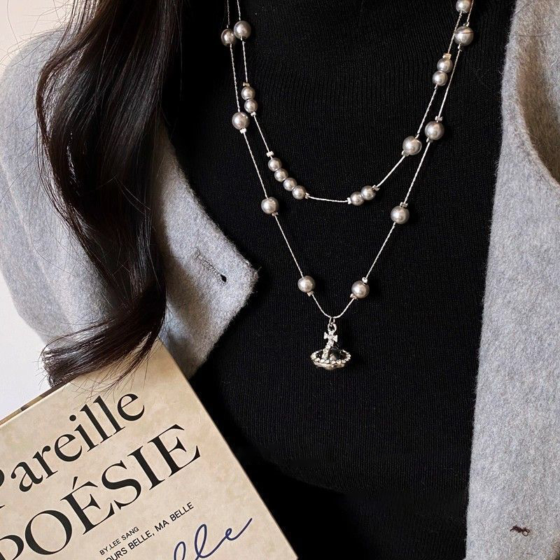 土星吊坠长款叠戴灰仿珍珠项链女秋冬轻奢高级感气质毛衣链配饰品