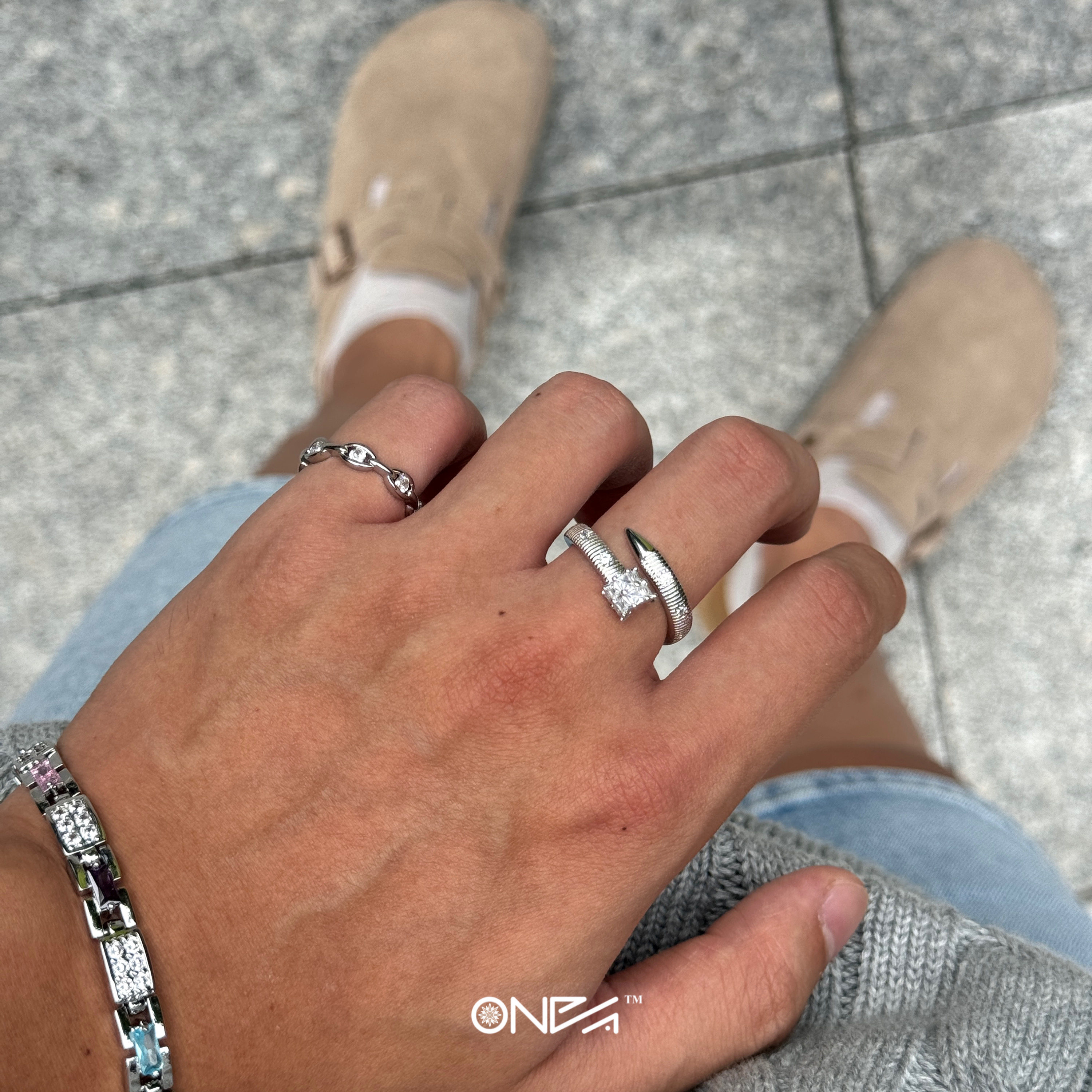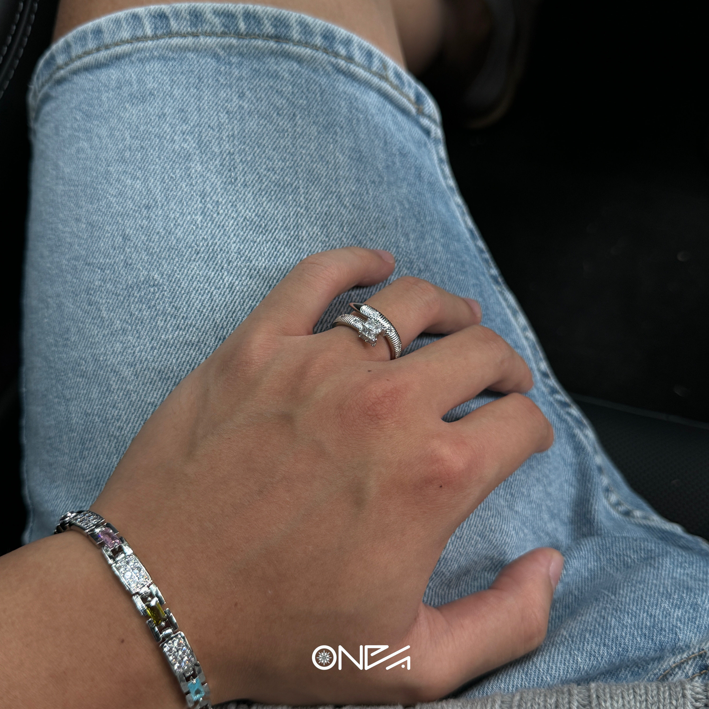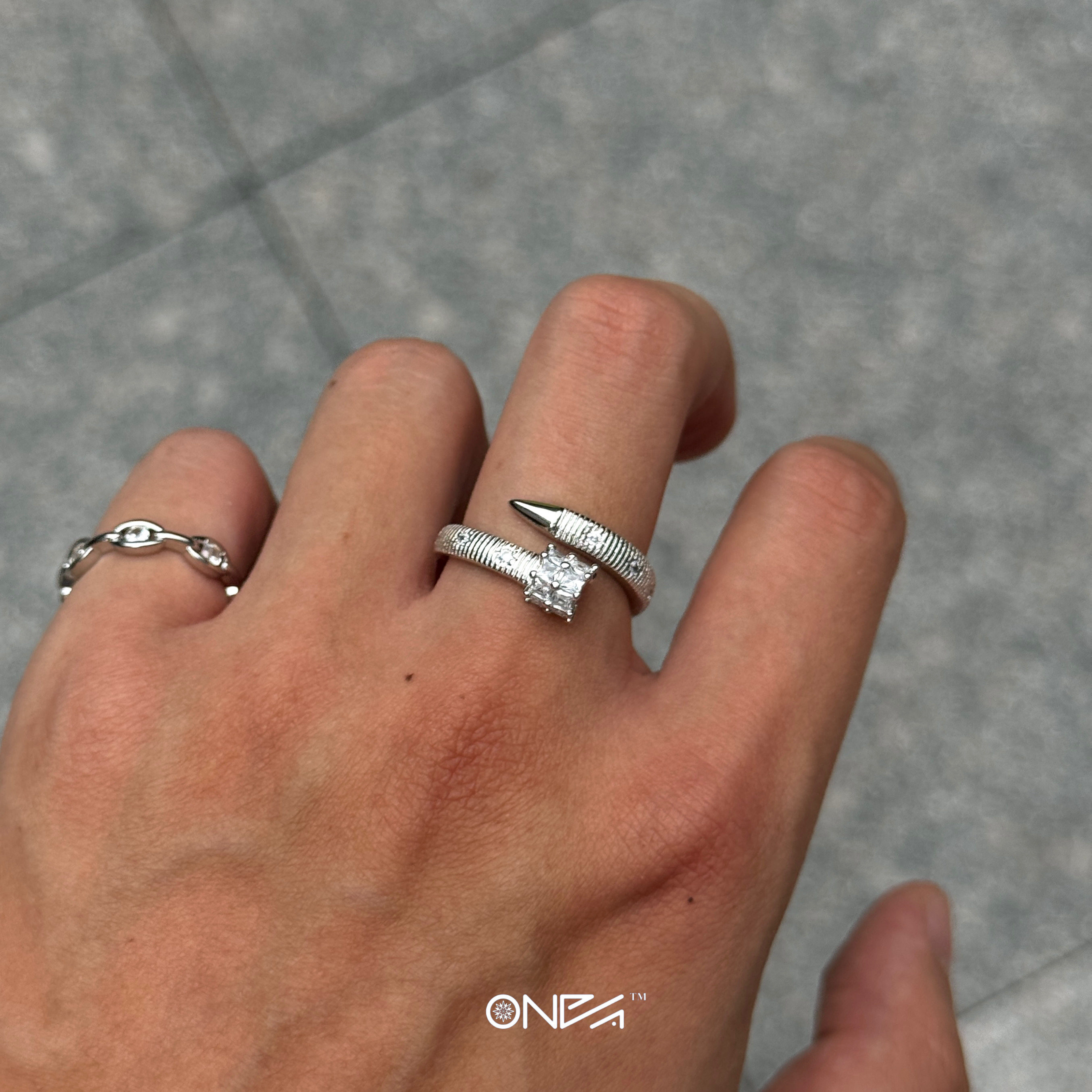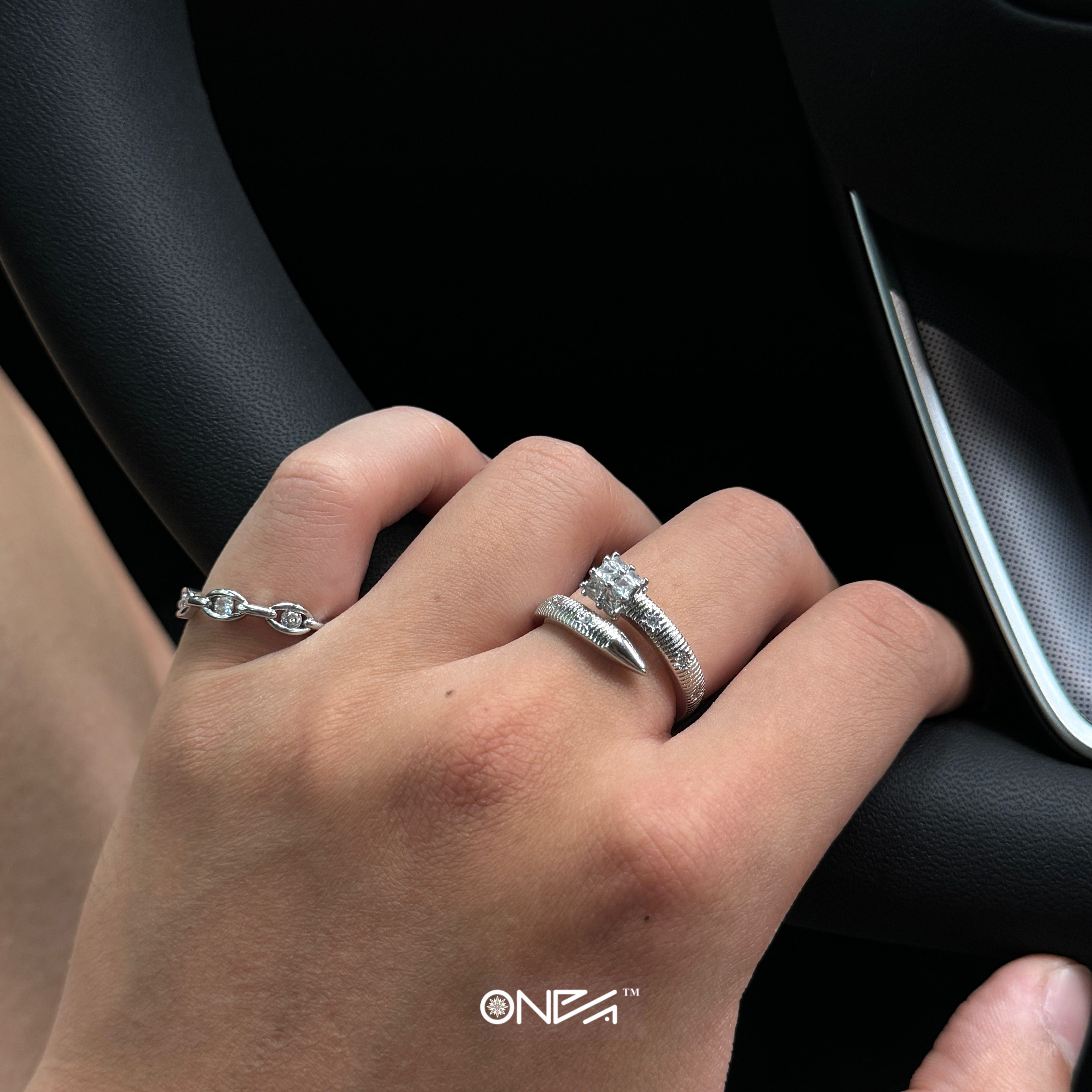 ONEPART满锆铆钉锤纹八芒星开口戒指开口男女铜合金合成锆石戒指