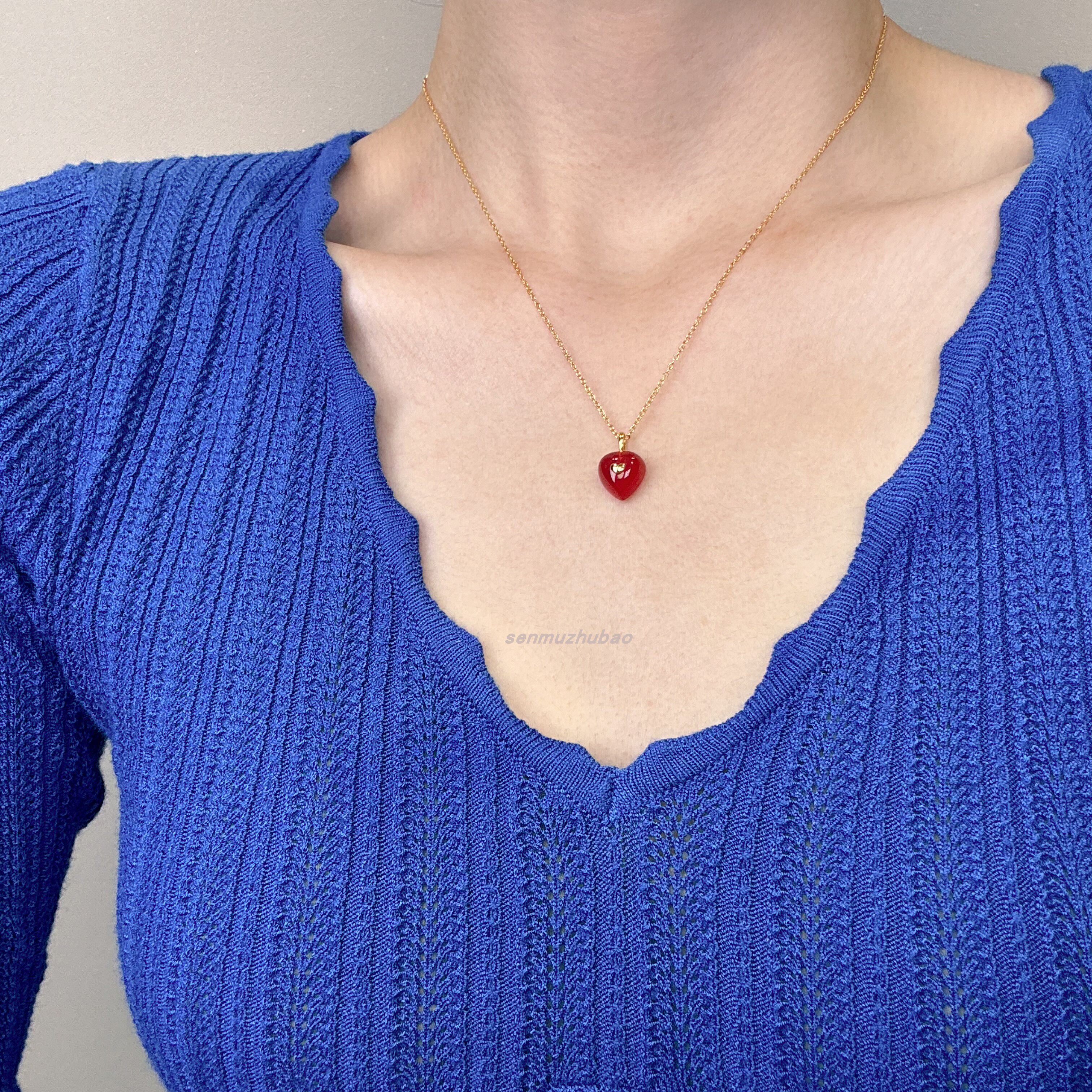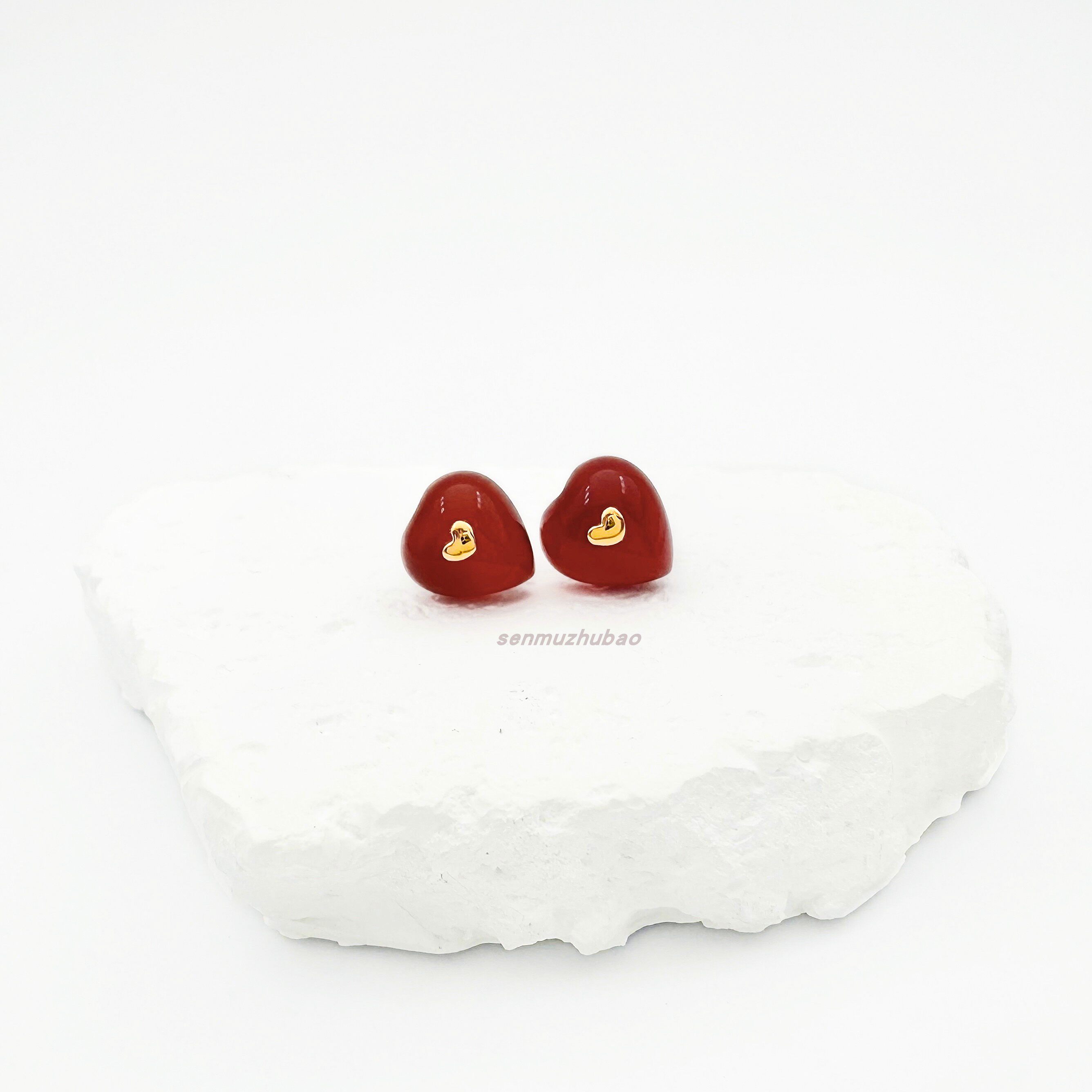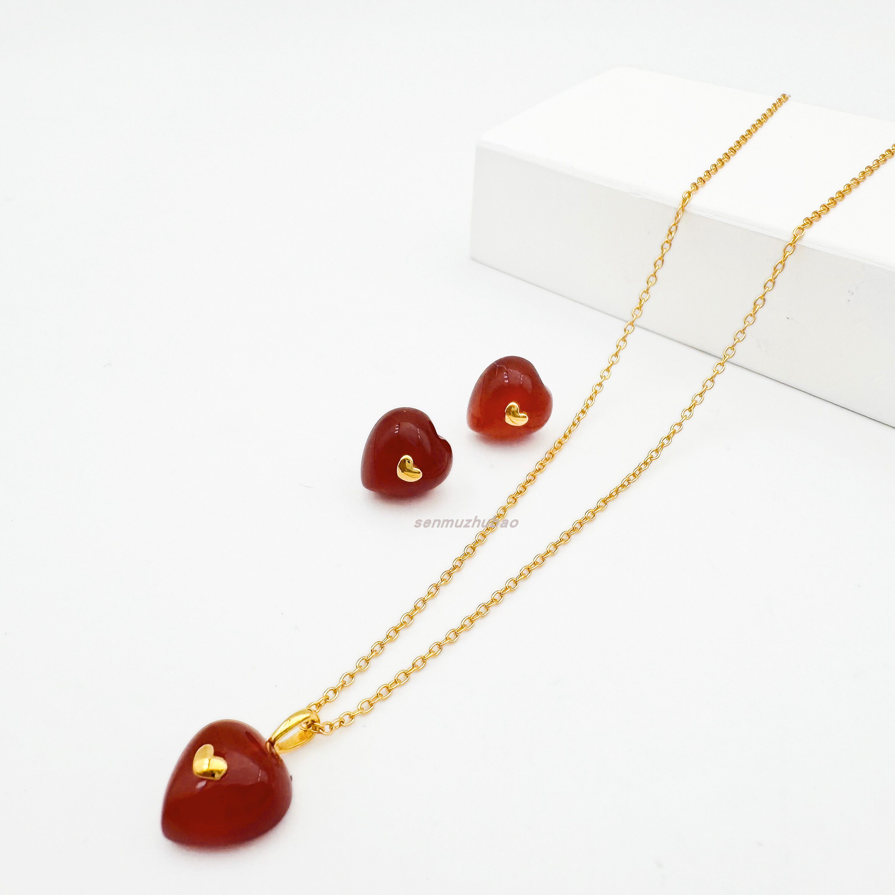 ins韩风极简可爱甜美心形925纯银镀金红色爱心红玉髓项链耳钉套装