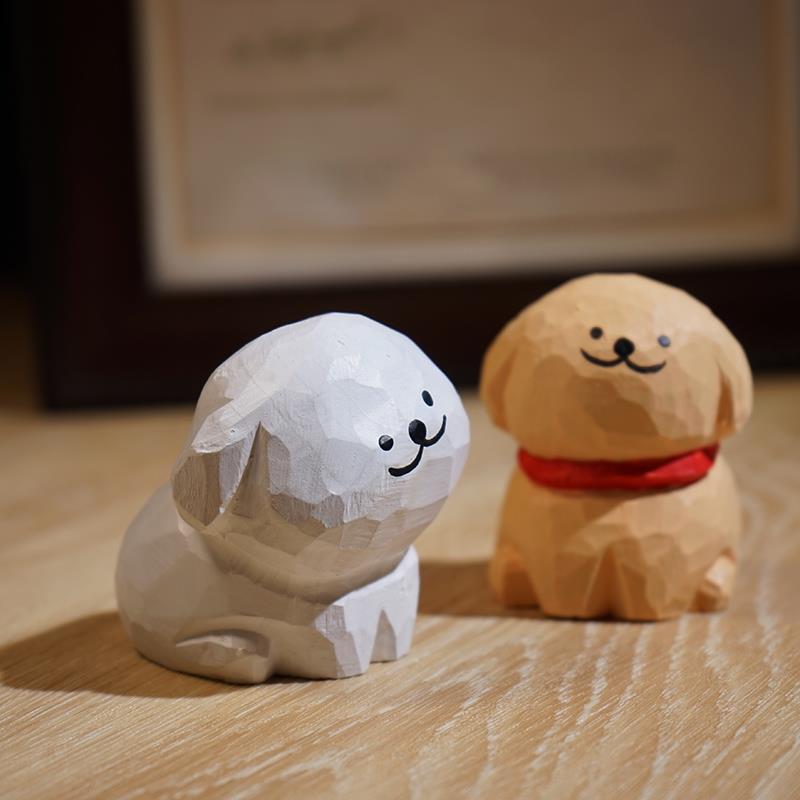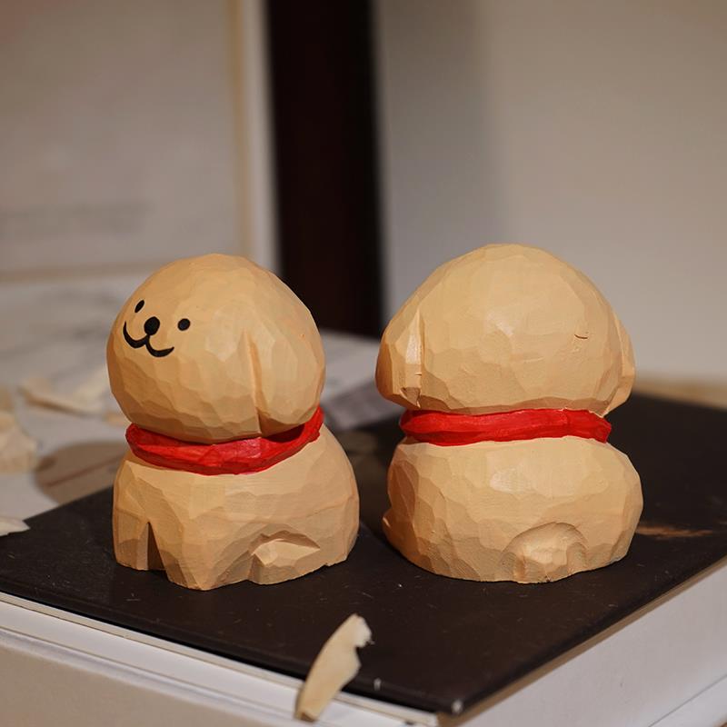 线条小狗手工木雕小摆件卡通可爱手绘办公室工位电脑桌面装饰品