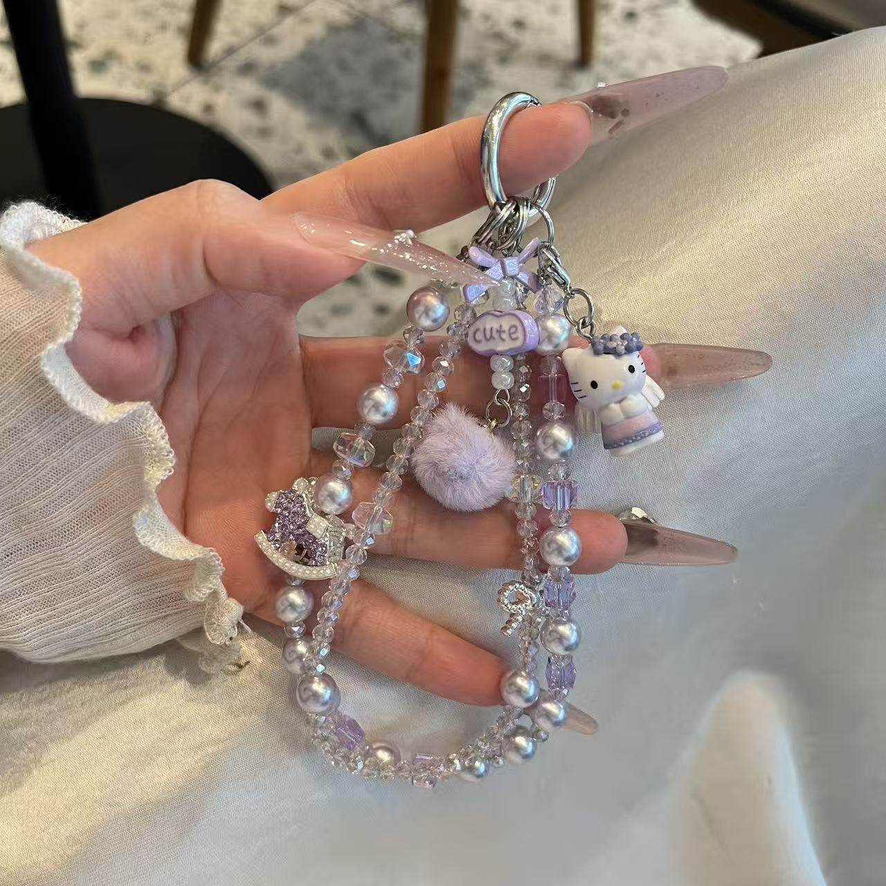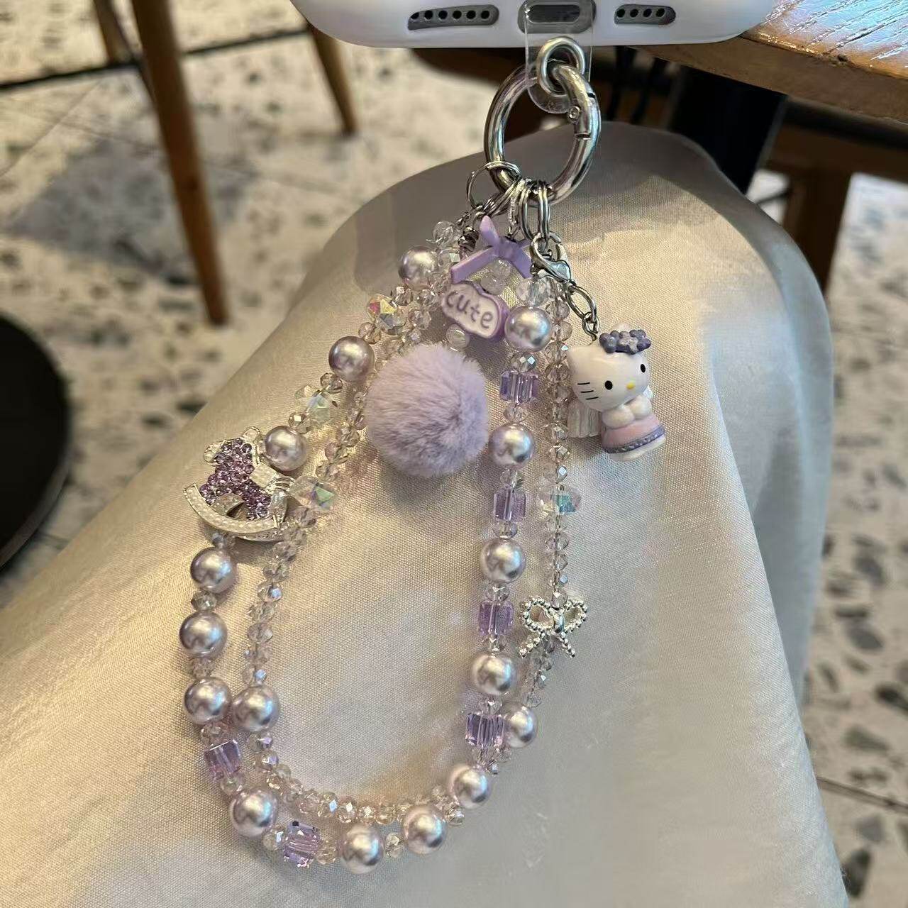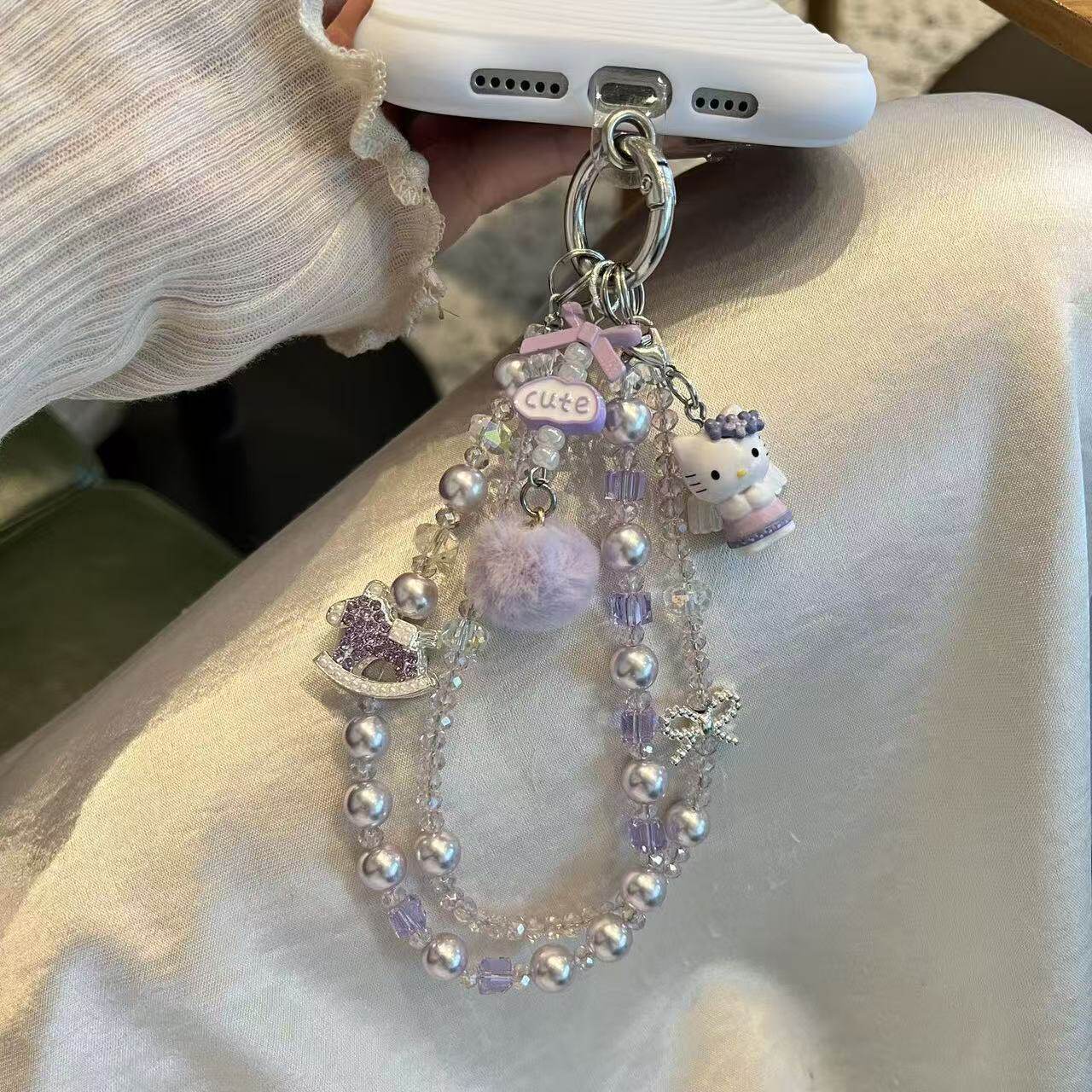 2026新紫色闪钻木马毛球串珠手机链kitty猫手机挂件钥匙链包挂件