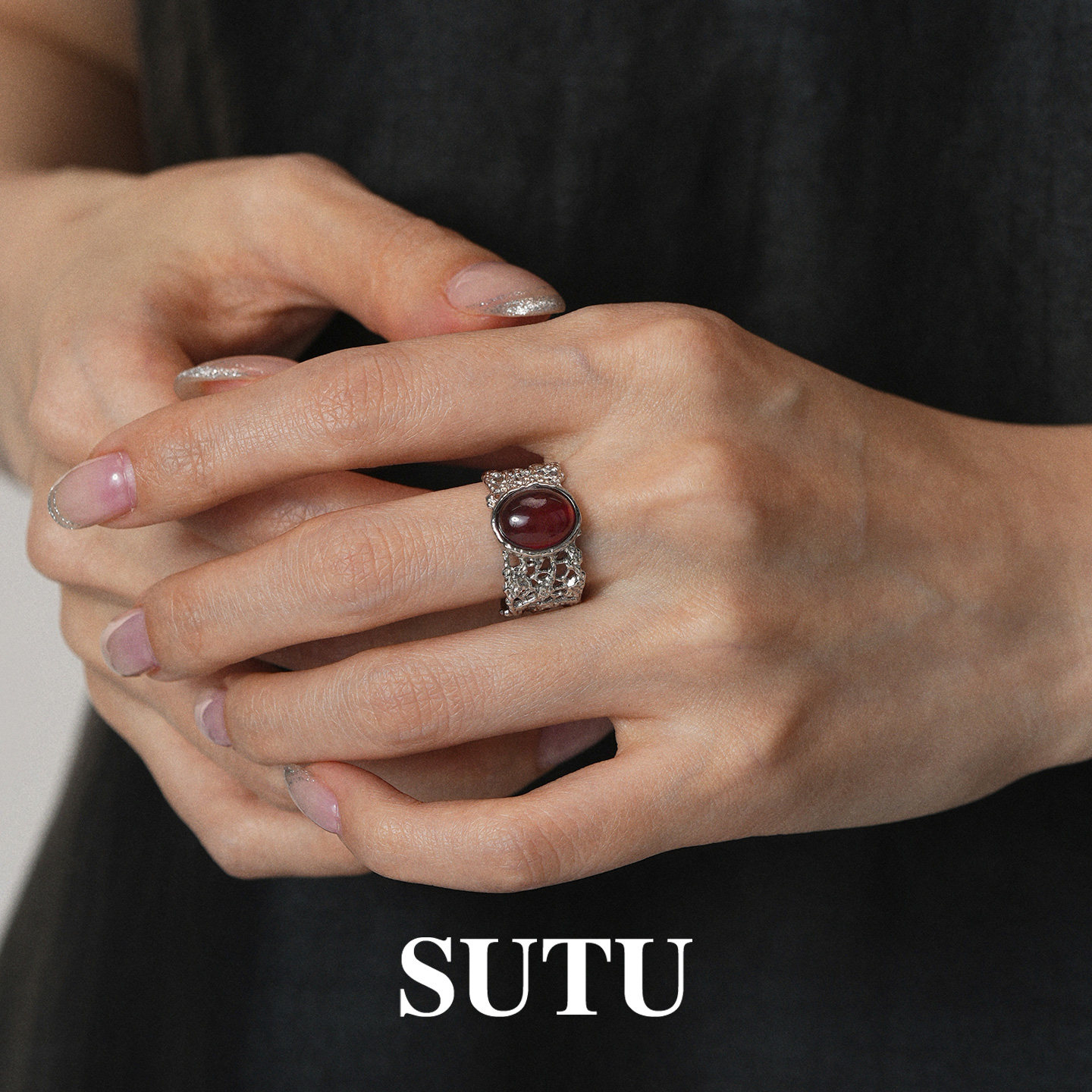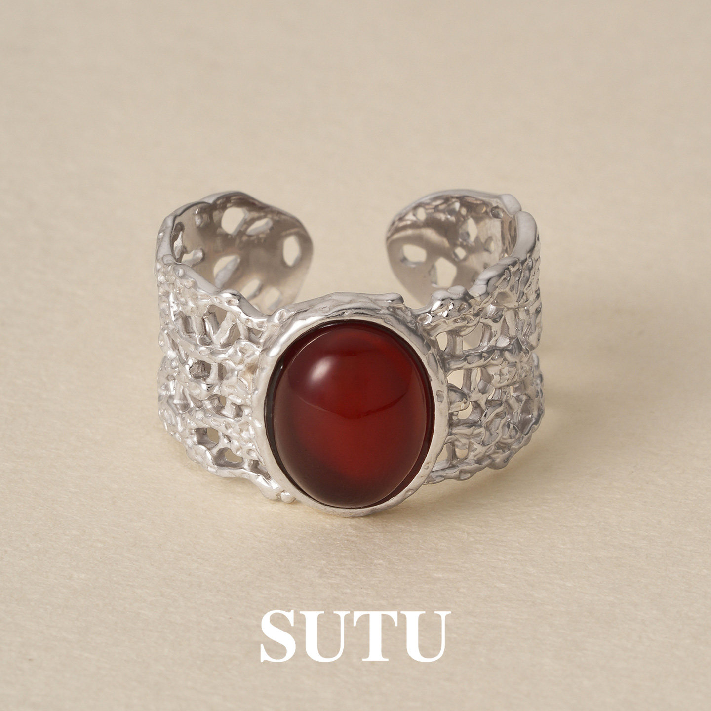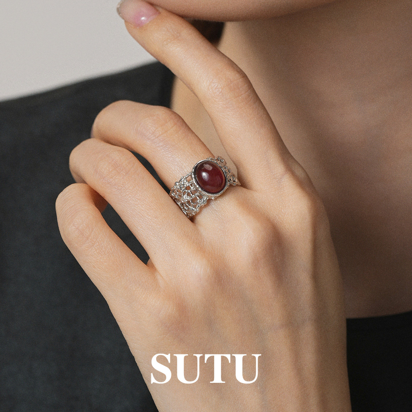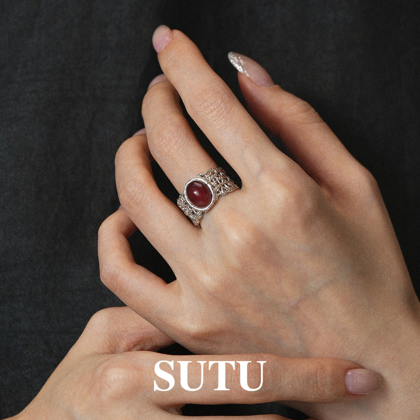素图蕾丝红玛瑙戒指925银小众设计复古气质轻奢高级本女命年指环