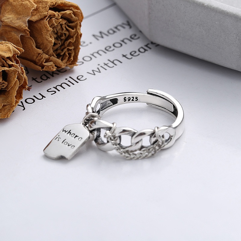 美汝仙 s925纯银韩版韩式链条造型拼接流苏英文小方牌开口戒指