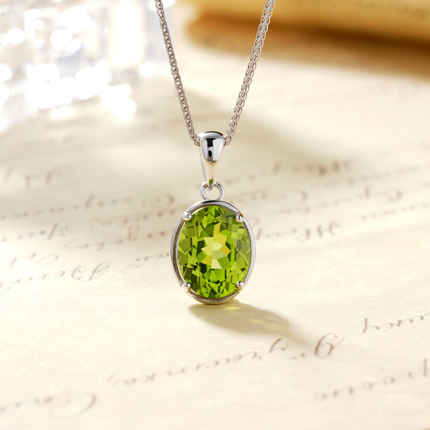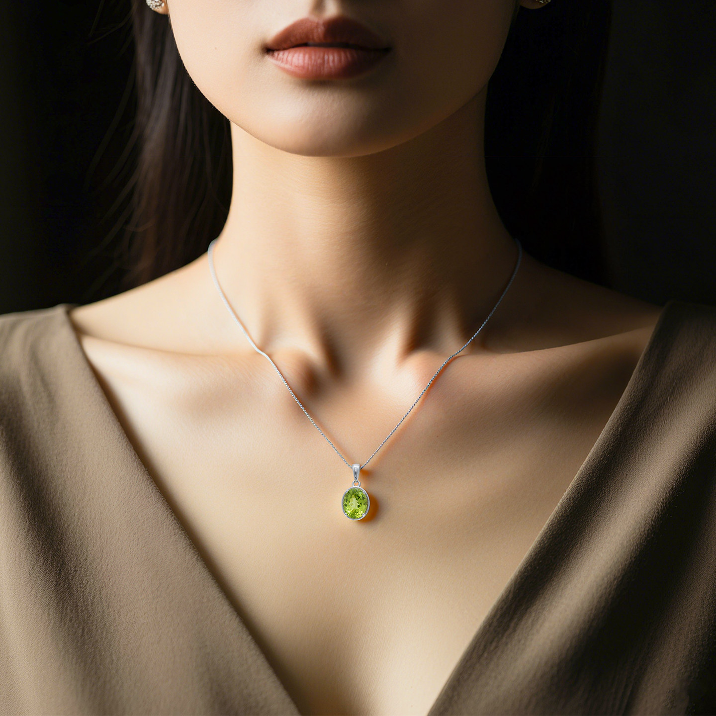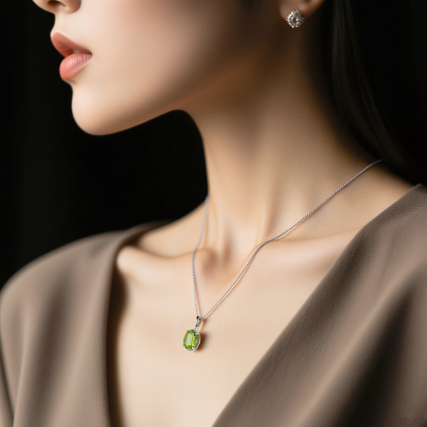 天然橄榄水晶吊坠女S925纯银项链镶嵌椭圆绿色宝石时尚简约百搭
