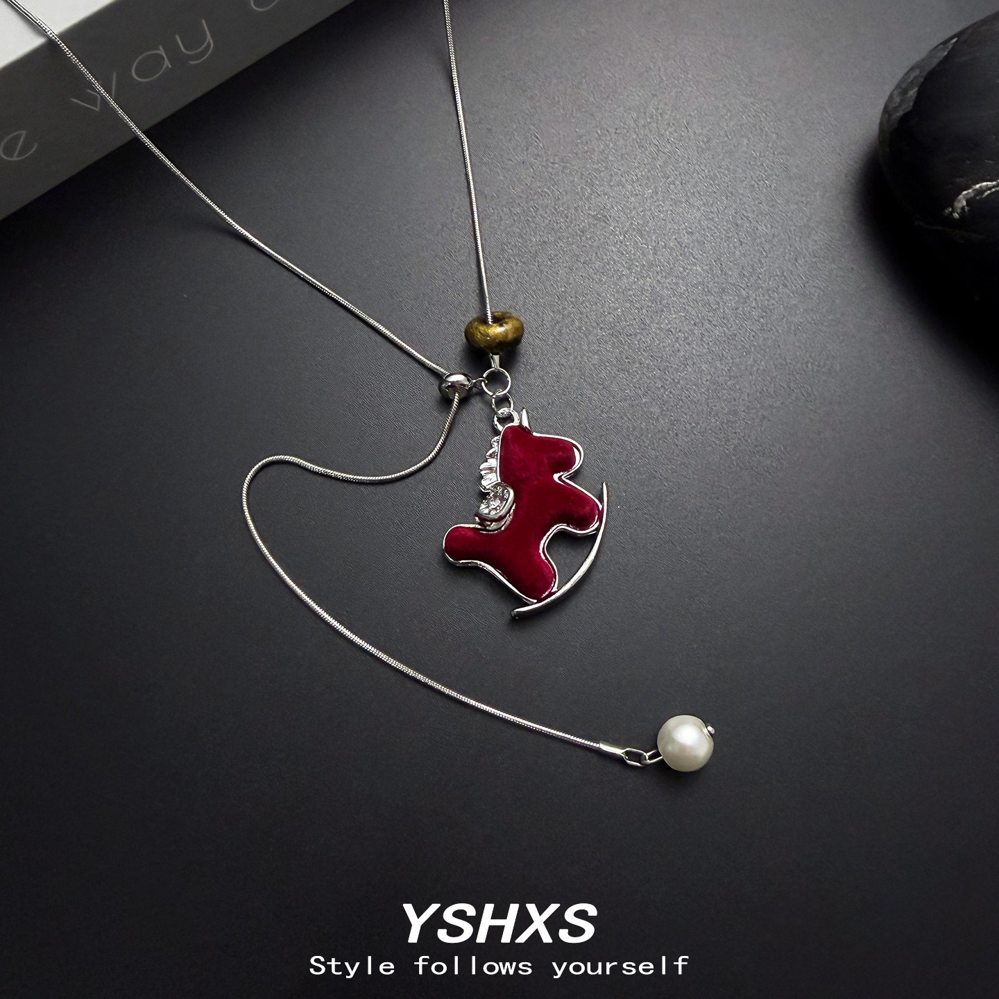 红色小马长款项链抽拉式设计小众时尚锁骨链流苏珍珠配饰