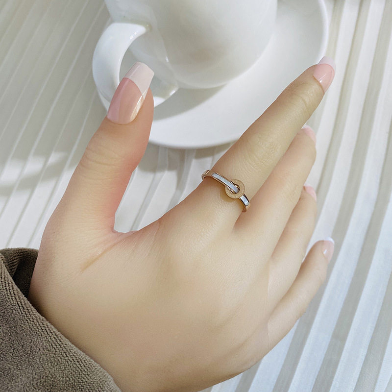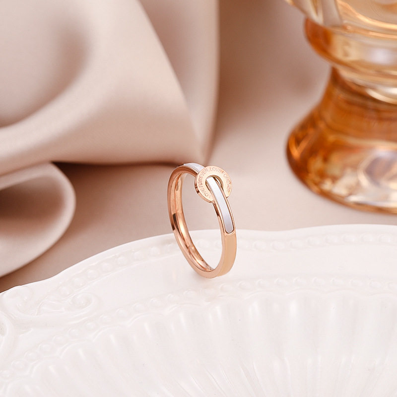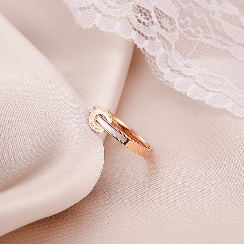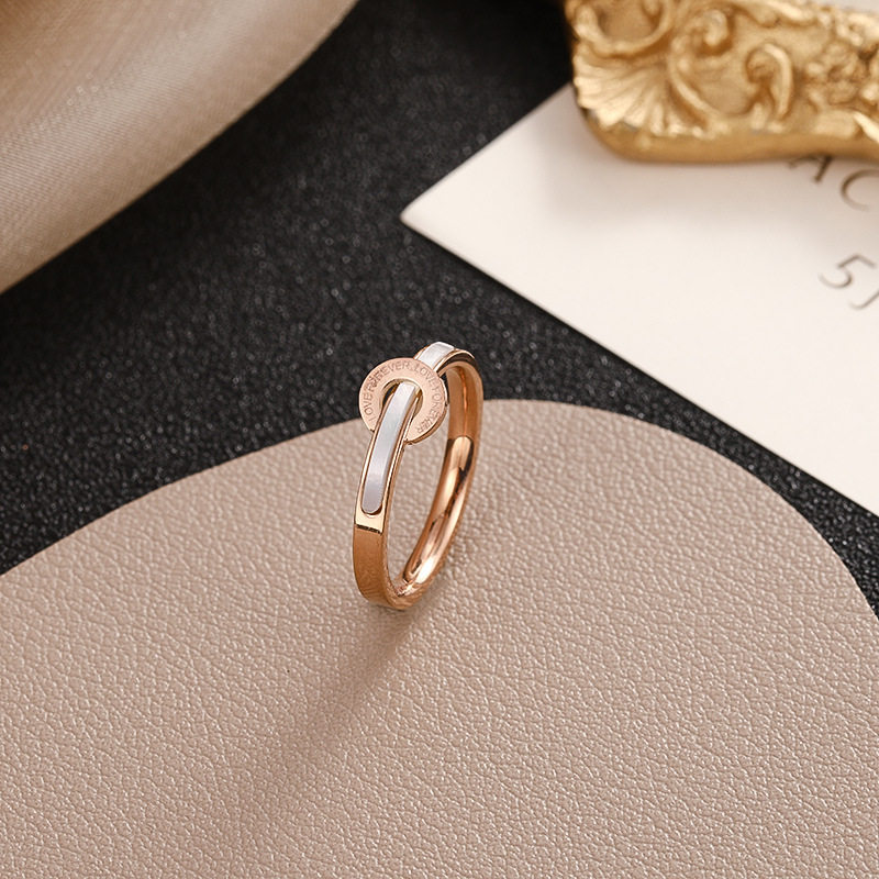 新款钛钢玫瑰金白贝壳字母戒指女 时尚简约高档情侣指环