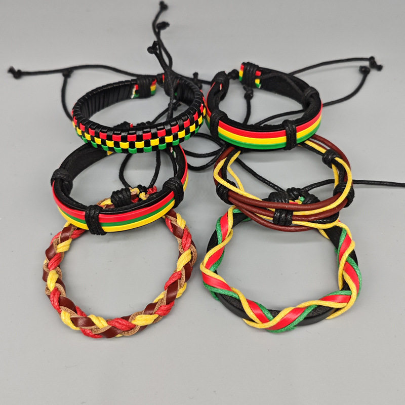 牙买加可调手环红黄绿拼色撞色编织皮革手链网红街舞多巴胺六件