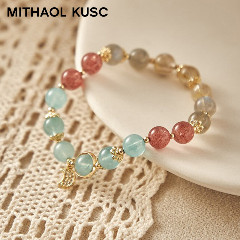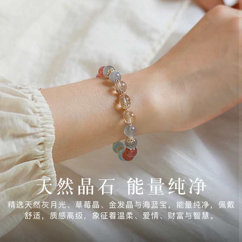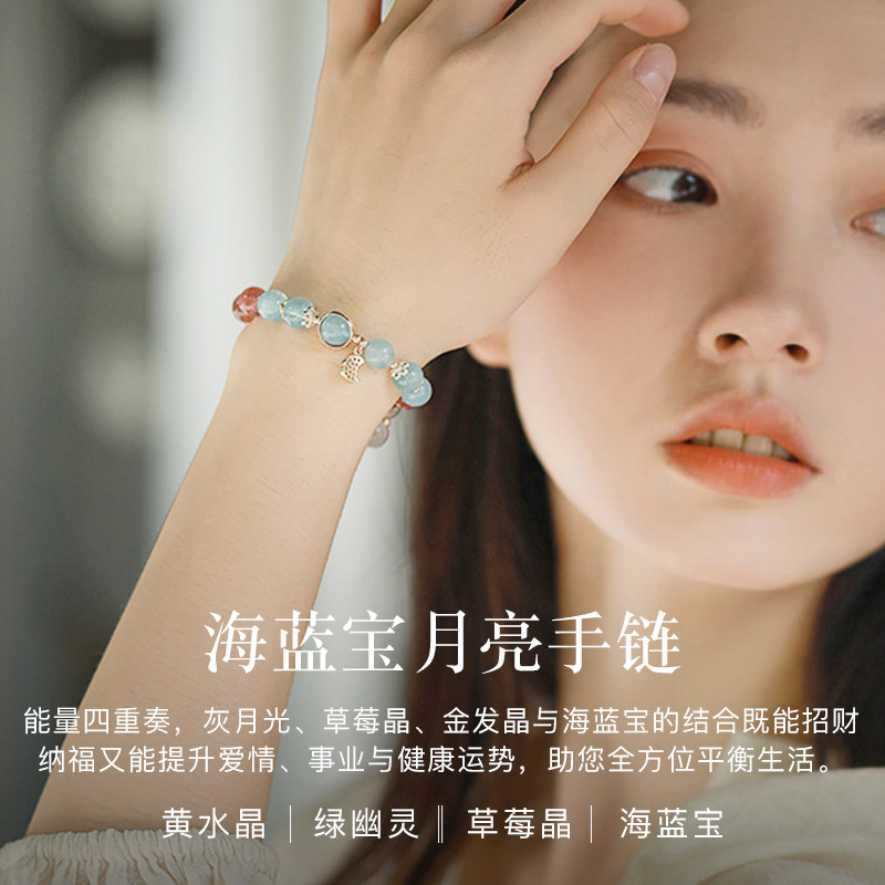 天然海蓝宝月亮水晶手链女 招财草莓晶金发晶手串女款铜镀金手饰